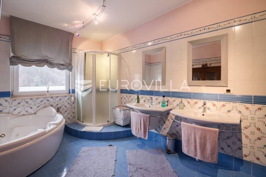 Dotrščina, park prirode, obiteljska kuća površine 450 m2 (razvedena u tri etaže), na prekrasno uređenom i održavanom zemljištu 1350 m2. Izuzetno mirna lokacija, 100m od autobusne stanice.Podrum: boravak uređen kao dječja igraonica (soba za zabavu), wc, vešeraj, kotlovnica, mini teretana...