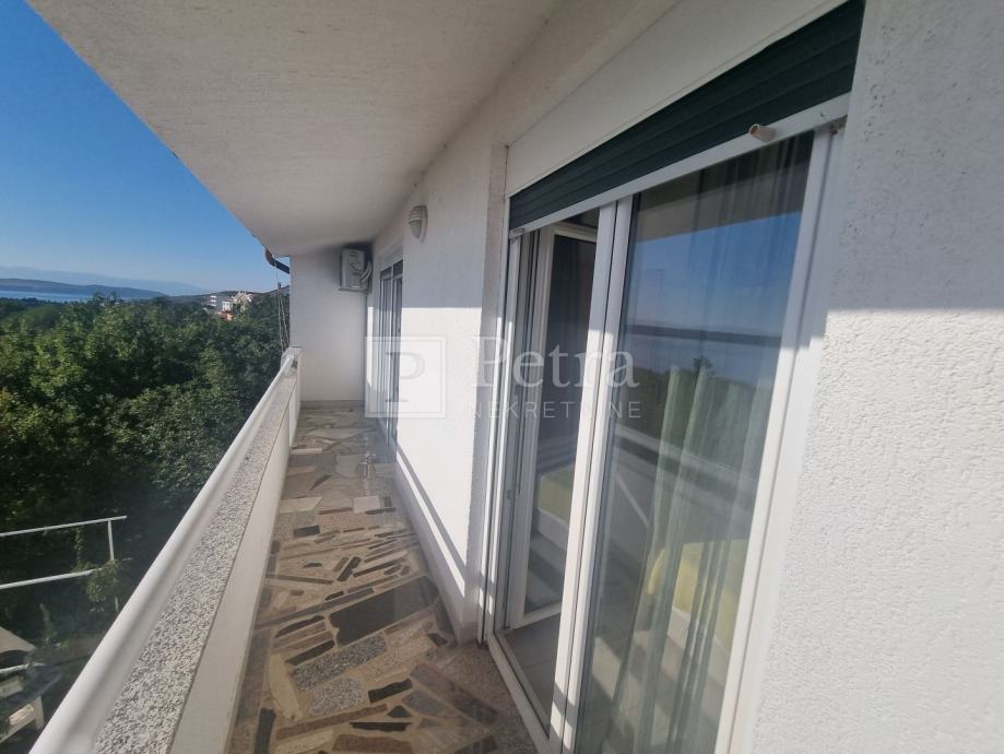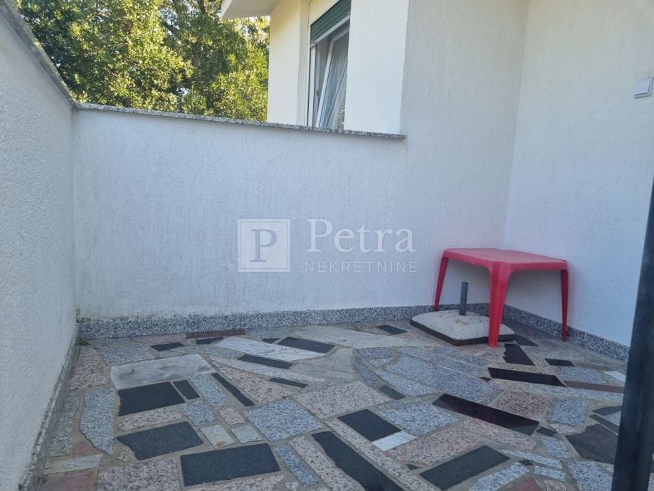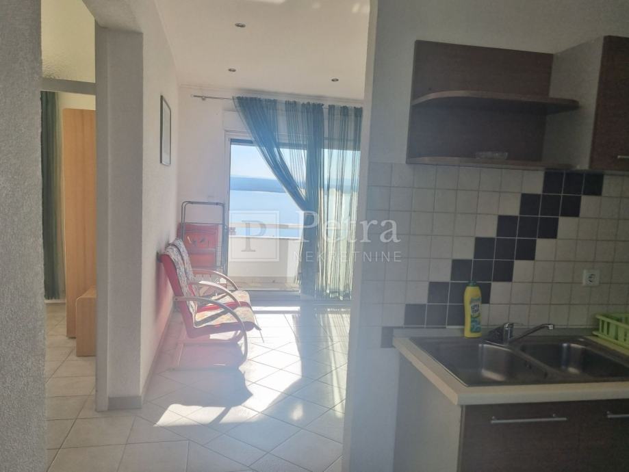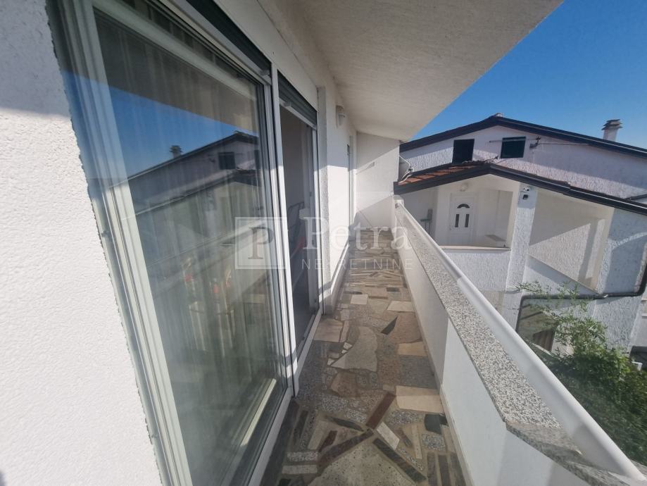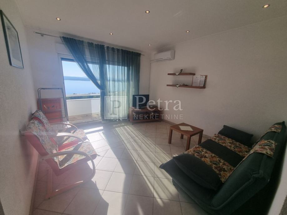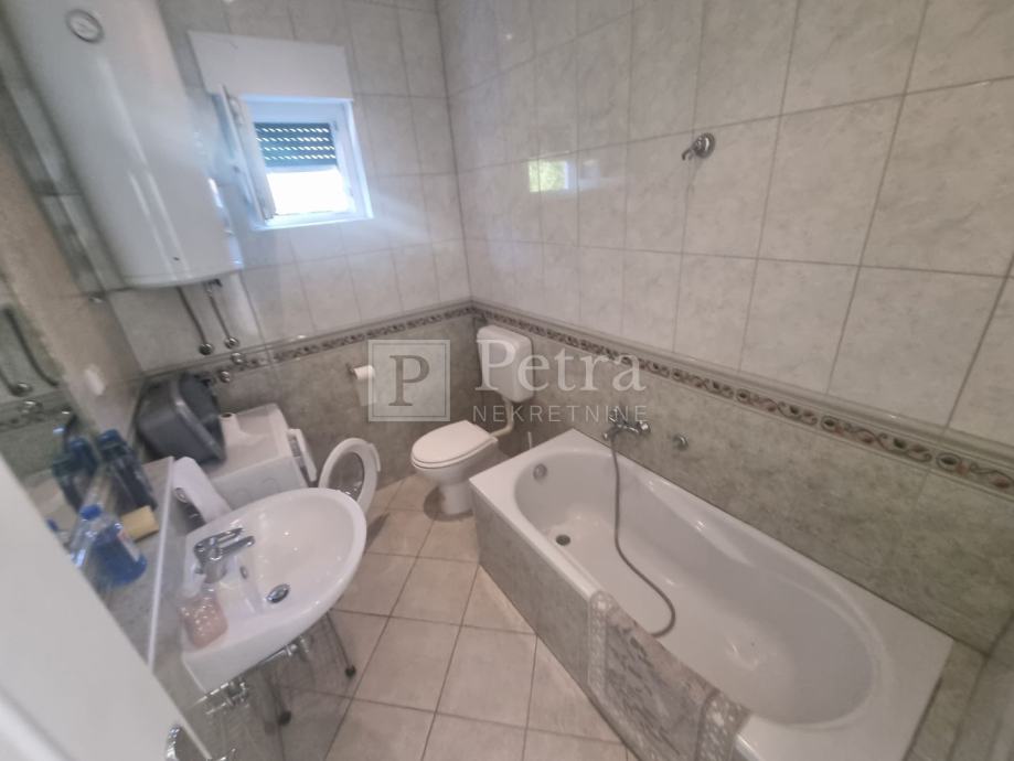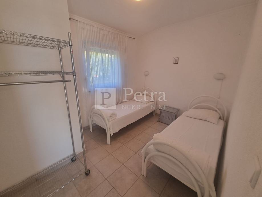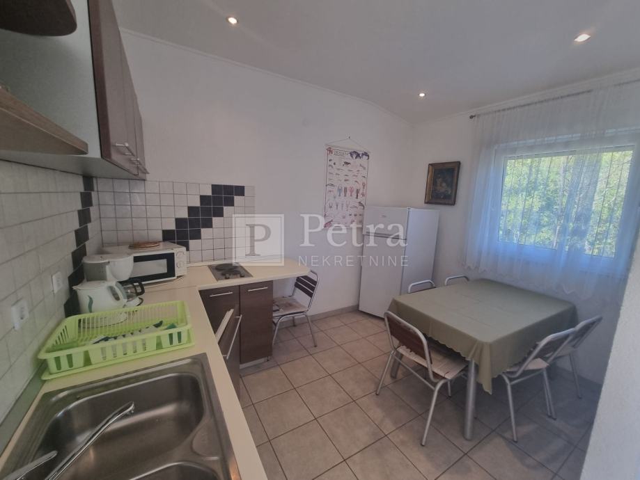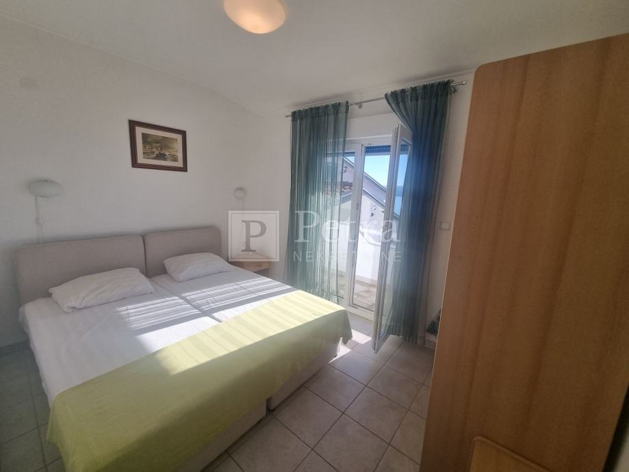 Stan u kući sa sveukupno dva stana. Nalazi se na prvom katu, a sastoji se od hodnika, kuhinje, dnevnog boravka sa izlazom na loggiu, dvije spavaće sobe i kupaonice. Sa loggie se pruža pogled na more. Do prve plaže 300 m. U procesu je etažiranja.