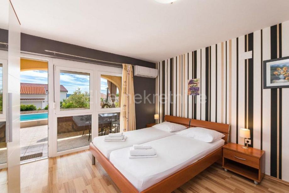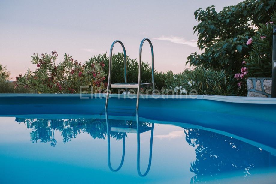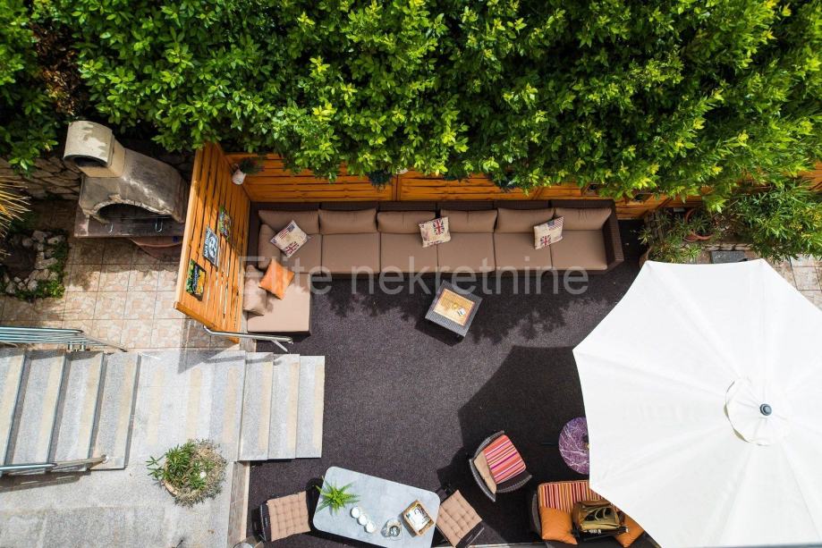 Predvorje ville opremljeno je ležaljkama za sunčanje, mini šankom, bazenom te mnogobrojnim začinskim biljem ovog dijela Hrvatske. Kuća s moderno i kvalitetno opremljenim apartmanima smjestila se 2. red od mora, u neposrednoj blizini svih važnih sadržaja.Ispred kuće se nalazi i parkiralište za goste.