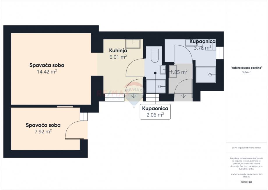 spavaće sobe površine 7,80 m2 (proizvoljno ulaz sa terase/stana) i kupaone površine 3,30 m2.