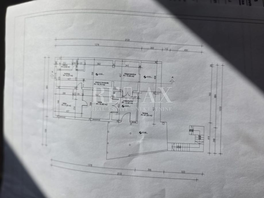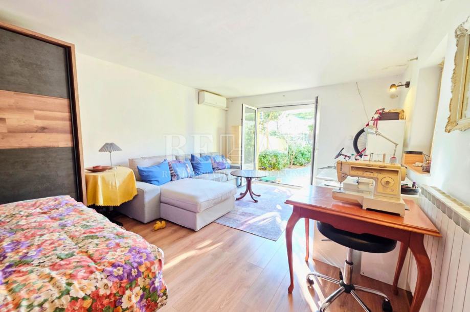 U prizemlju se nalazi stan površine 112,98 m² koji se sastoji od zatvorene ulazne verande, dvije velike spavaće sobe, prostrane kupaonice te otvorenog dnevnog prostora koji uključuje kuhinju i dnevni boravak s izlazom na terasu s pogledom na more. Ispred stana nalaze se dvije terase, od kojih je jedna natkrivena sjenicom, a druga otvorena i pruža panoramski pogled na more. Na okućnici se nalazi pomoćna zgrada površine 9 m². Stan je opremljen klima uređajem, a grijanje je etažno putem peći na pelete koja zagrijava obje stambene jedinice putem radijatora.