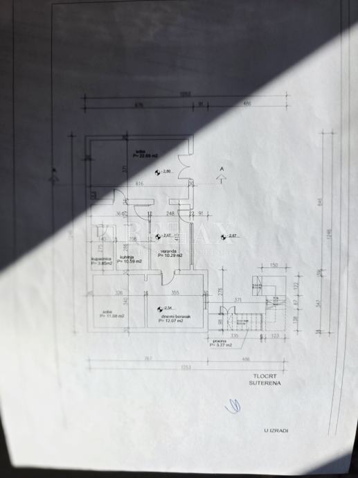 U suterenu se nalazi stan površine 87,87 m² s ulazom kroz ostakljenu verandu. Iz verande se ulazi u spavaći dio povezan s dodatnom prostorijom koja je prenamijenjena u prostrani walk-in ormar. Tu su i kuhinja, kupaonica te velika prostorija koja kombinira dnevni i spavaći prostor s direktnim izlazom na okućnicu.
