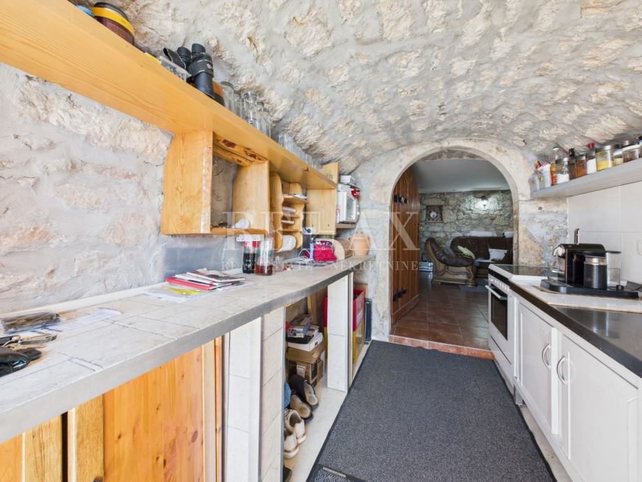 Kuća se prostire na tri etaže, svaka s posebnim sadržajima koji doprinose njezinoj funkcionalnosti i udobnosti. Prizemlje odiše toplinom zahvaljujući šarmantnom spoju kamena i drveta te nudi prostrani dnevni boravak s blagovaonicom, potpuno opremljenu kuhinju, jednu spavaću sobu i kupaonicu. Na prvom katu nalazi se potpuno namješten stan kojem posebnu vrijednost daje natkrivena terasa s predivnim pogledom na more. Stan se sastoji od hodnika, spavaće sobe, kupaonice te otvorenog prostora u kojem su smješteni kuhinja, blagovaonica i dnevni boravak. Drugi kat krije tri studio apartmana, svaki s vlastitom kupaonicom i čajnom kuhinjom. Iz ovog prostora izlazi se na prostranu terasu, idealnu za uživanje u pogledu i opuštanje.