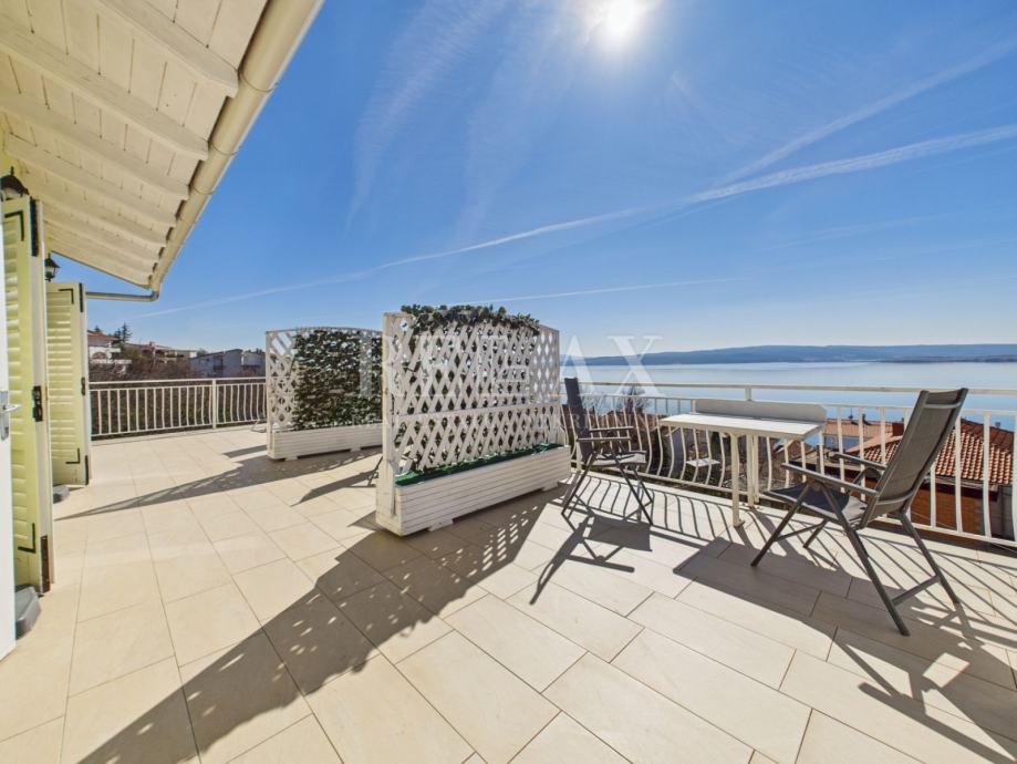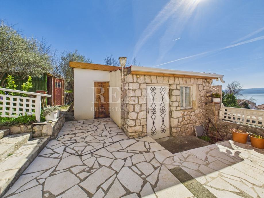U mirnom dijelu Dramlja, na kraju ulice, smještena je ova prostrana samostojeća kuća s panoramskim pogledom na more i otok Krk. Sa stambenom površinom od 145 m², velikim terasama i uređenom okućnicom od 659 m², ova nekretnina pruža savršen spoj komfora, privatnosti i blizine mora. Od plaže je udaljena samo 450 metara pješice, dok se centar mjesta nalazi na 1,5 km.