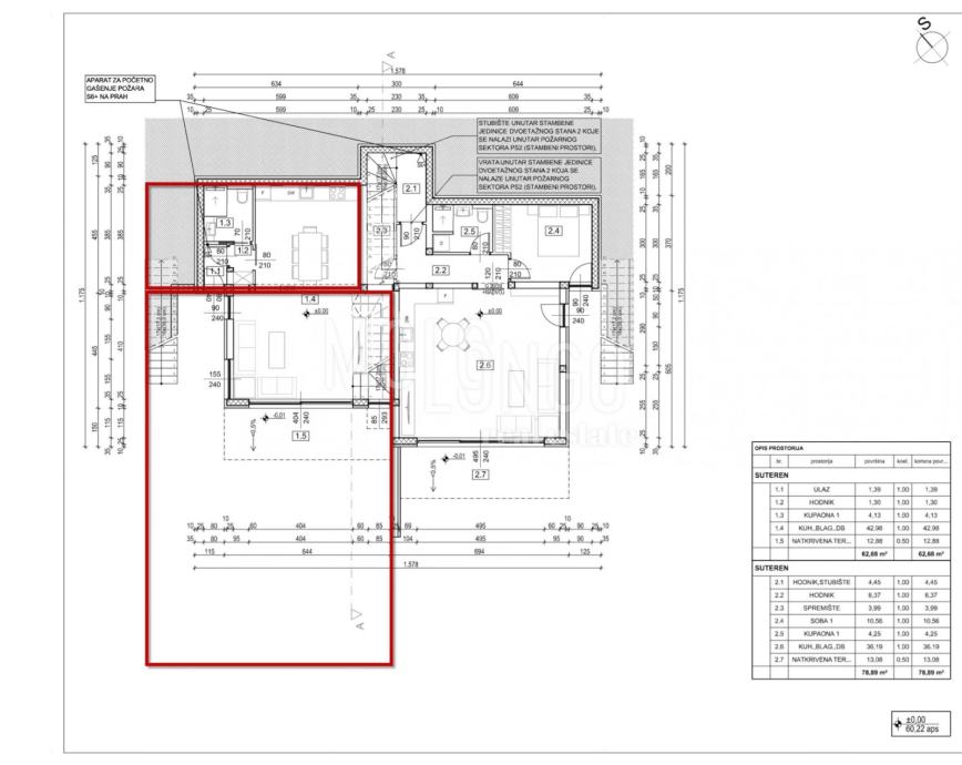 Donja etaža sastoji se od hodnika, kupaone, te open space dnevnog boravka s kuhinjom i blagavaonom koji se produžuje na natkrivenu terasu površine 13 m2. Osim toga stanu pripada oko 200 m2 okućnice sa vlastitim parkirnim mjestima, bazenom, vrtom i drugim sadržajima.