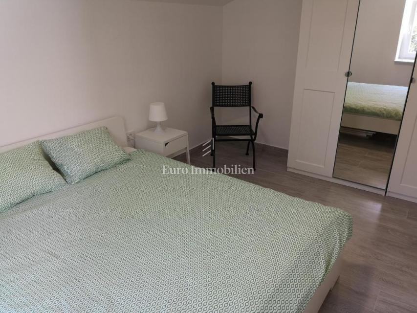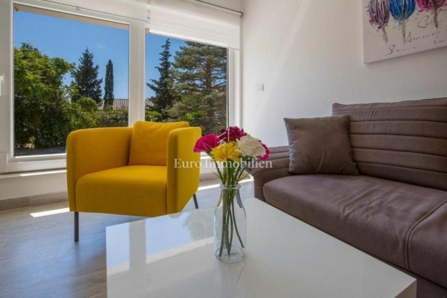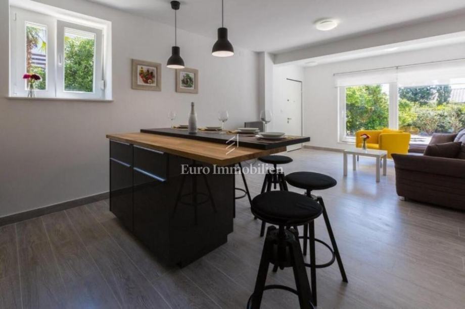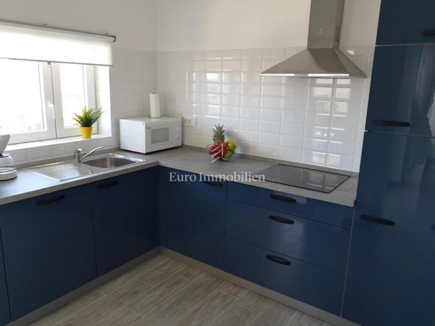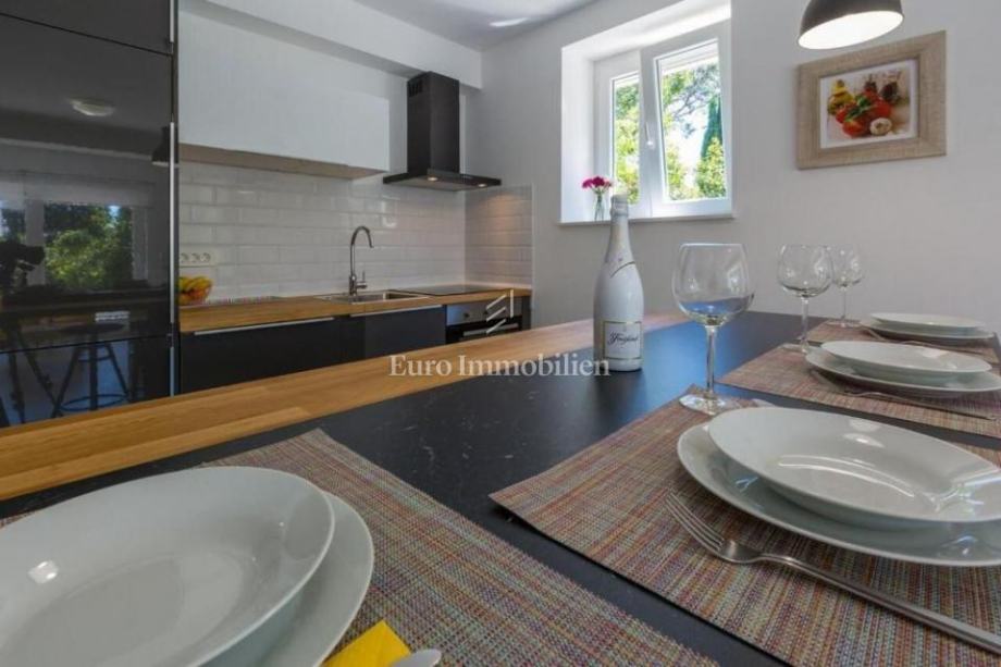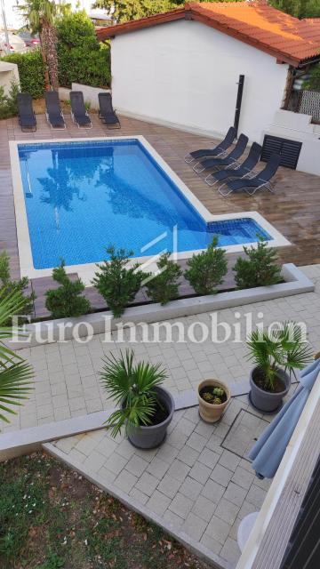 Kuća je tlocrtne površine 12.5 x 10 te se sastoji od četiri stana i odvojenog objekta u dvorištu iza kuće. U prizemlju se nalaze dva stana. Manji stan je površine 37 m2 + 3 m2 terase dok je površina većega stana u prizemlju 44 m2 + 10 m2 terase. Na prvom katu nalazi se stan od 75 m2 + 25 m2 terase dok je na drugom katu stanu iste površine kao i na prvom katu pripada još i malo spremište od 1,5 m2. U dvorištu je odvojeni objekt s terasom površine je 30 m2. U dvorištu je i natkriveni parking gdje je moguće parkirati pet vozila, te lijepi bazen površine 32 m2. Na objektu su obnovljene sve instalacije (voda, struja, kanalizacija), postavljena je nova vanjska PVC stolarija, te unutarnja stolarija. Kuća ima i nove podove i kupaonice dok je s vanjske strane nova fasada, krov i novo popločeno dvorišta. Ulazi u stanove opremljeni su protuprovalnim vratima, napravljena je i priprema za alarmni sustav, a svaka soba u kući ima klima uređaj. Kuća se prodaje kompletno opremljena sa svim namještajem. Objekt, s obzirom na lokaciju i uređenost je svakako i dobra prilika za investiciju i turističku djelatnost, kategoriziran je s 4* te može dobiti i 5* i na Booking.com stranici je ocijenjen s ocjenom 9.6 (exceptional).