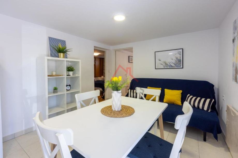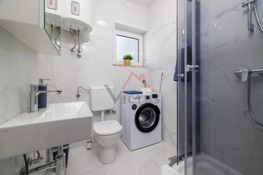 Kuća se sastoji od prizemlja i 3 kata. U prizemlju se nalazi apartman s dvije spavaće sobe, na prvom katu je apartman s tri spavaće sobe, dok su na drugom i trećem katu smještene dvije garsonijere i dva apartmana s jednom spavaćom sobom. Svi apartmani na gornjim etažama imaju terase s pogledom na more. Kuća se prodaje kompletno opremljena, te svi apartmani posjeduju kuhinju i renovirane kupaonice s perilicom za rublje.