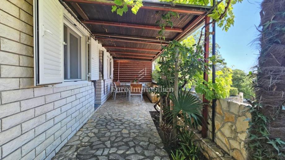 Natkrivena terasa pruža predivan pogled na more i zelenilo, pružajući miran kutak za uživanje u svježem zraku i prekrasnom pogledu.