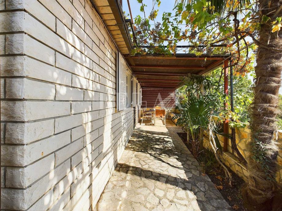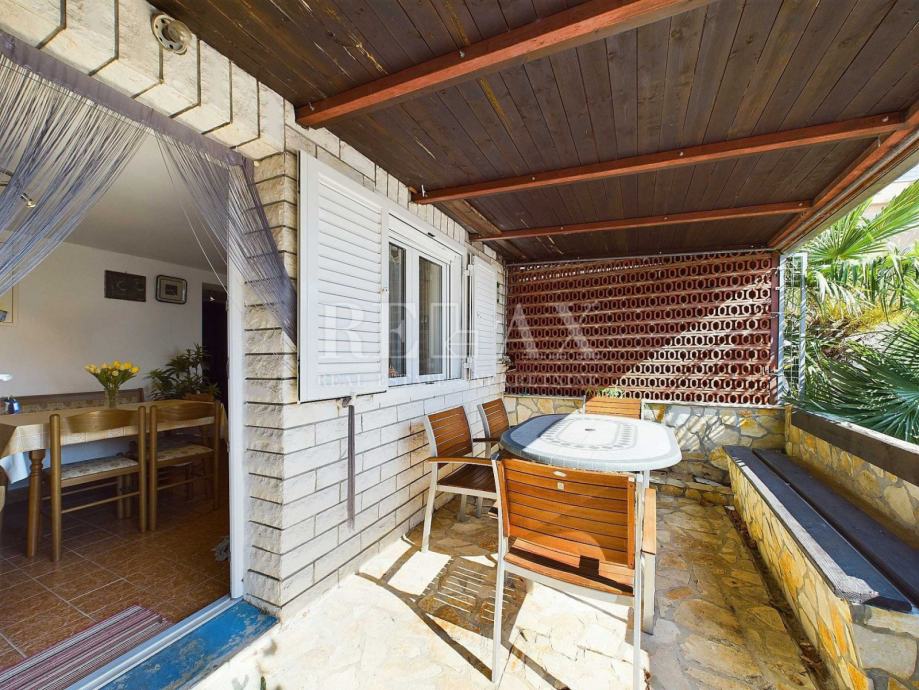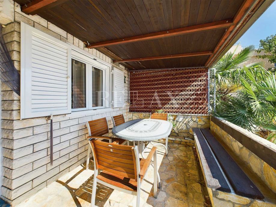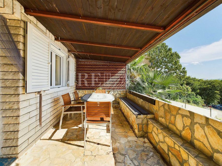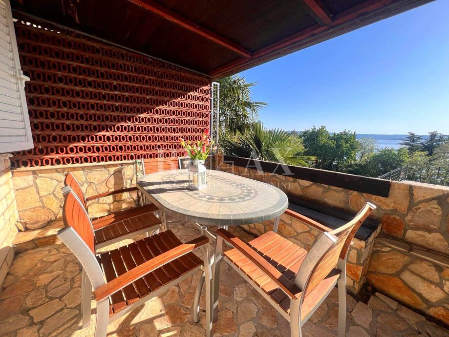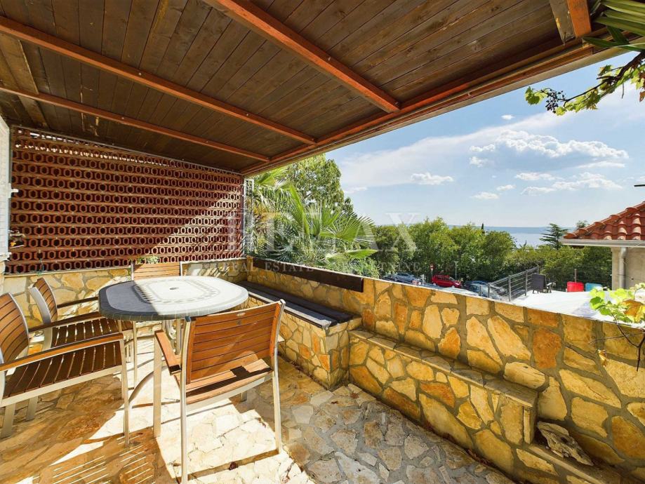 Natkrivena terasa pruža predivan pogled na more i zelenilo, pružajući miran kutak za uživanje u svježem zraku i prekrasnom pogledu.