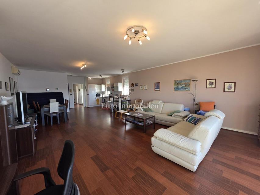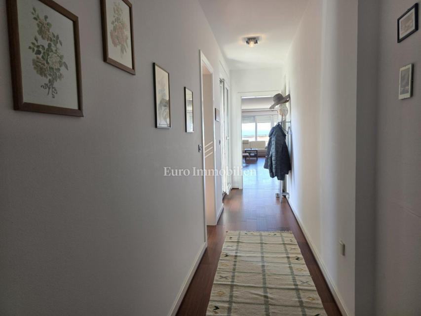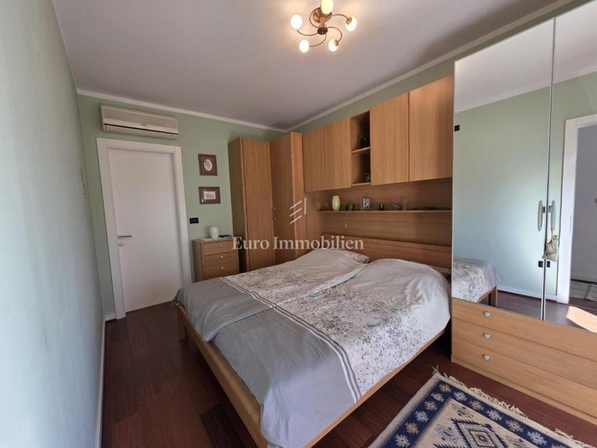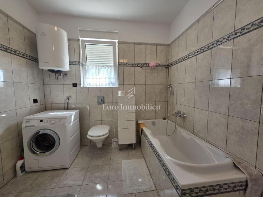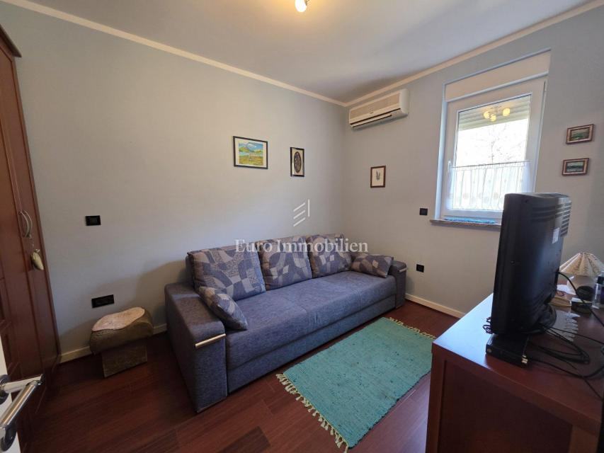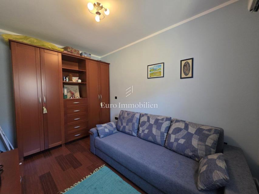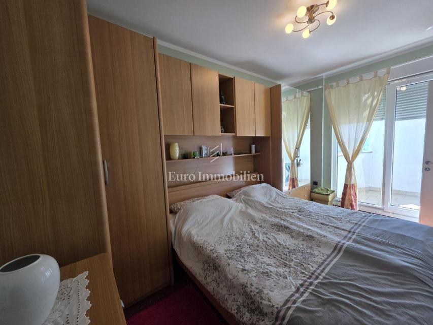 Sastoji se od dvije spavaće sobe, hodnika, kuhinje s blagovaonicom, dnevnog boravka, WC-a, kupaonice, balkona i terase s prekrasnim pogledom na more. U potpunosti je namješten, klimatiziran i opremljen podnim grijanjem. U prizemlju zgrade nalazi se spremište te je parkirno mjesto osigurano unutar okućnice.