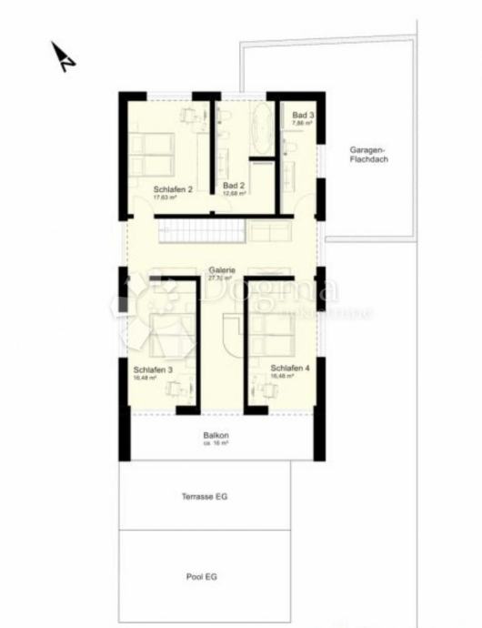 - Na gornjem katu: do gornjeg kata dolazi se ravnim, čvrstim stubištem, gdje se i po potrebi može postaviti stubišni lift. 3 prostrane spavaće sobe, od kojih je jedna master bedroom sa vlastitom kupaonicom. 2 su smještene na katu i obe su opremljene sa kadom. U medjuprostoru galerija i izlaz na veliki balkon.