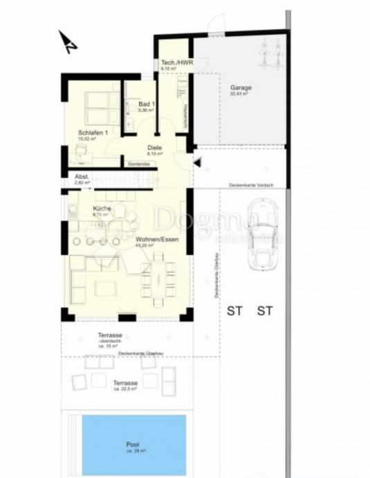 - prizemlje: prostrani ulazni/garderobni dio s gostinjskom sobom, gostinjskim wc-om i tehničko-gospodarskim prostorom. Osvijetljeni dnevni prostor s velikom blagavaonicom i otvorenom kuhinjom, sve skupa u prostranoj open-space varijanti, smještenoj prema jugu i zapadu. Izlaz na veliku terasu i bazen. Nasuprot kuhinje nalazi se praktično spremište ispod stubišta. Gostinjski wc sa tušem.
