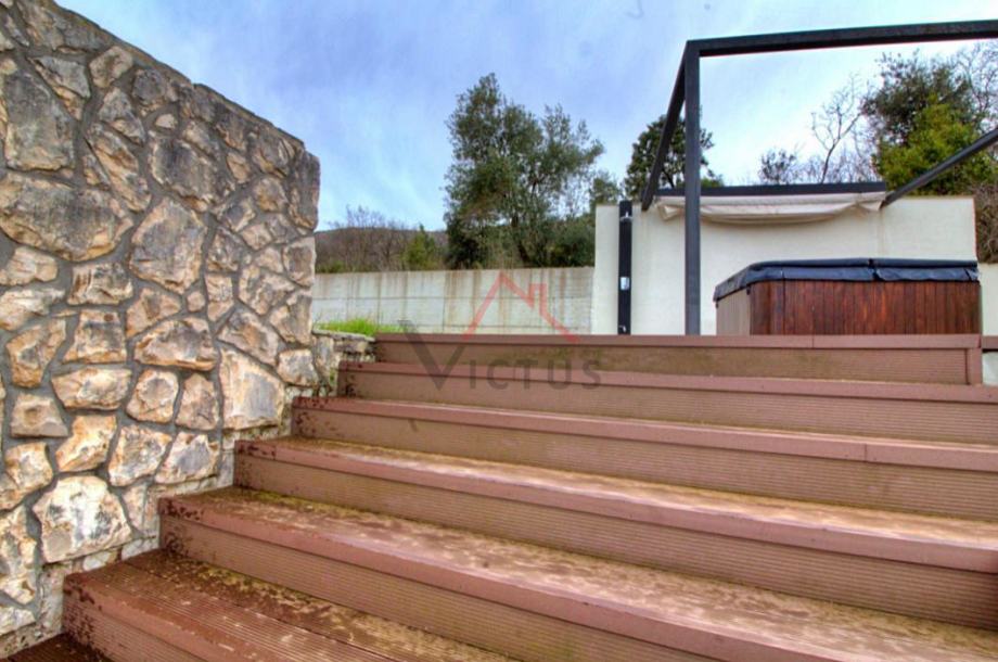 Zemljište je veličine 821 m2 te je ograđeno, okoliš kuće je uređen i kultiviran. U stražnjem dijelu kuće je jacuzzi uz ljetnu kuhinju i igralište. Garaža je veličine 30 m2, a praonica i spremište u također prizemlju kuće. Parking je omogućen za 4 do 5 automobila s time da su dva parkirna mjesta natkrivena. Za navodnjavanje okoliša koristi se voda iz vlastite cisterne (23 m3).