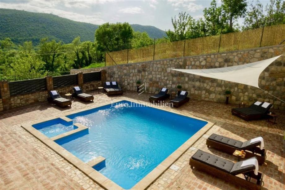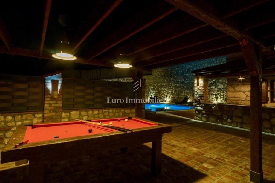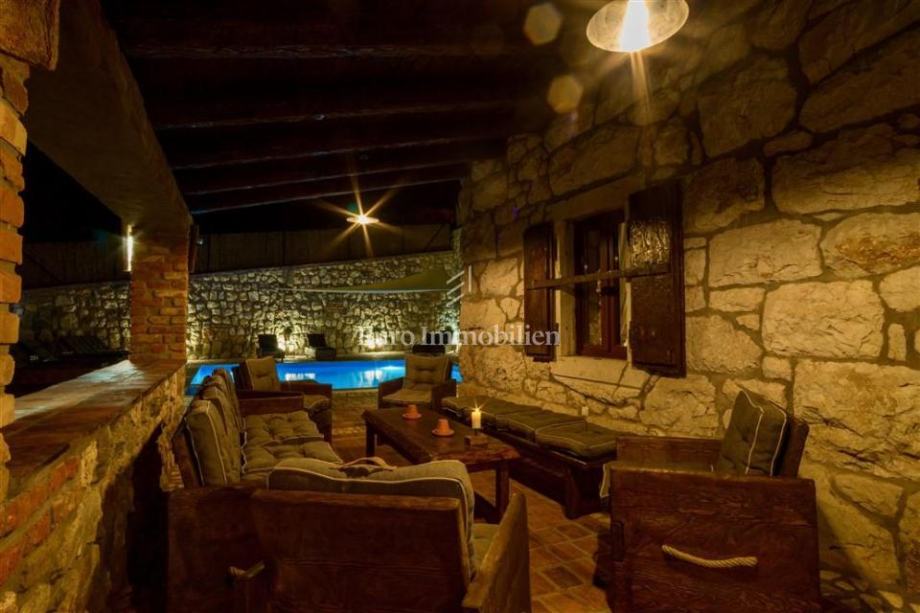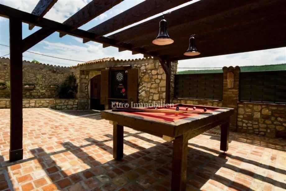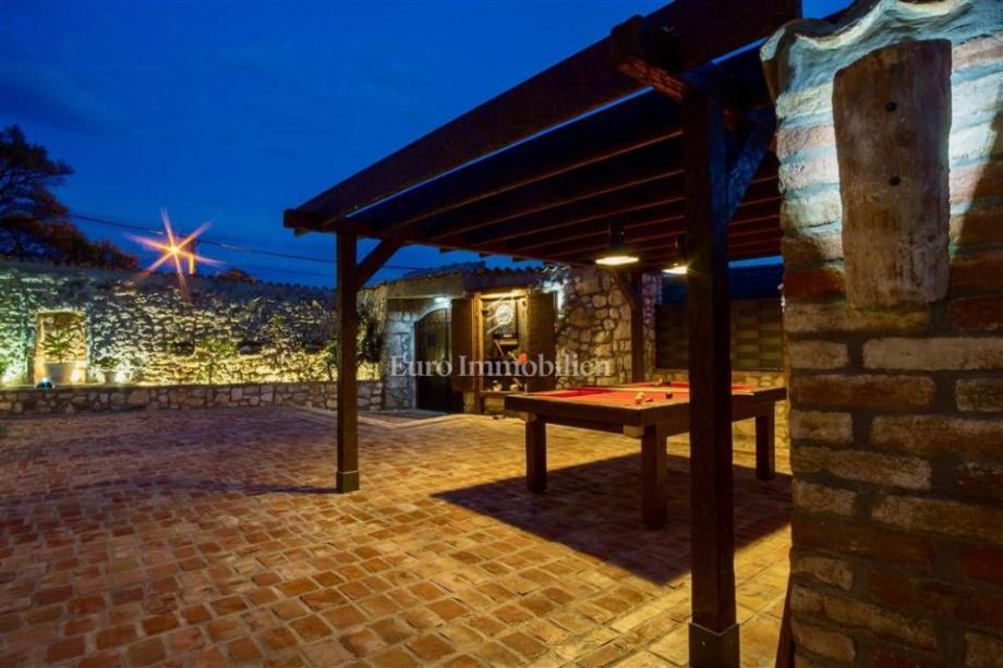U prizemlju kuće je veliki dnevni boravak, kuhinja te natkriveni prostor vanjske terase, uz jednu spavaću sobu i kupaonicu. Kat je unutarnjim stepenicama povezan s prizemljem, ali je cijeli spavaći dio (3 spavaće sobe svaka s vlastitom kupaonicom). Unutar uređene i popločane okućnice je bazen sa sunčalištem.