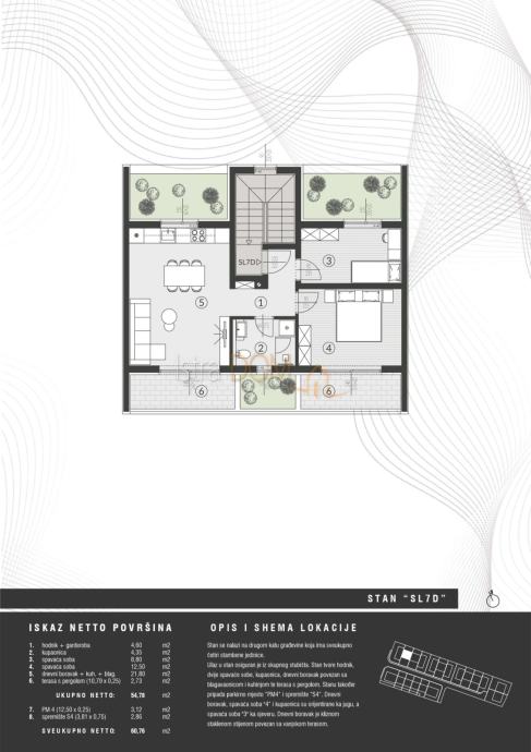 Stan se sastoji od hodnika, dvije spavaće sobe, dnevnog boravka povezanog sa blagovaonicom i kuhinjom, kupatila te terase sa pergolom.
