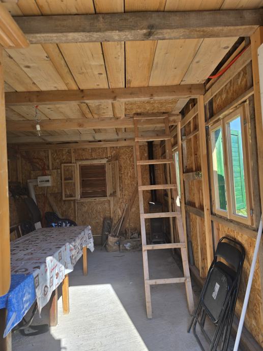 Kućica je građena od OSB ploča obloženih poluoblicama, što joj daje onaj šarm starinske planinske kolibe. Unutra je jedna otvorena prostorija predviđena za kuhinju i blagovaonu, a iznad nje tavanski prostor koji može postati ugodno mjesto za spavanje. Tu je i alatnica, zatim mala prostorija za wc i tuš, a izvana natkrivena nadstrešnica koja čeka stol, klupu i čašu domaćeg vina. Pored kuće započeti roštilj već sanja prve kobasice i kotlovinu, a bunar osigurava vodu.