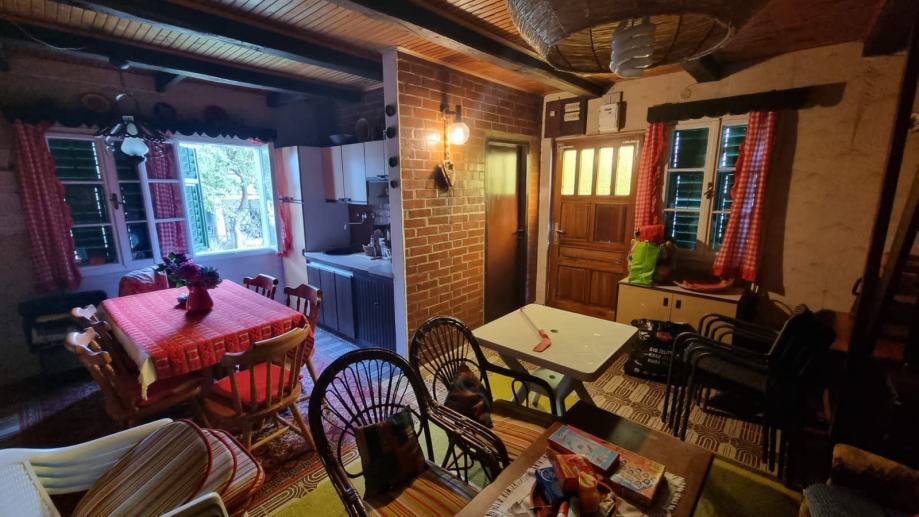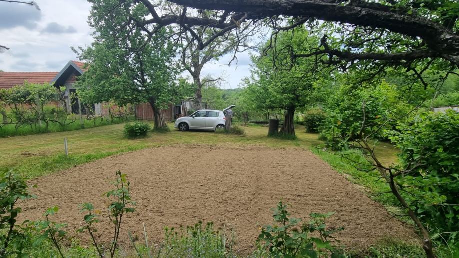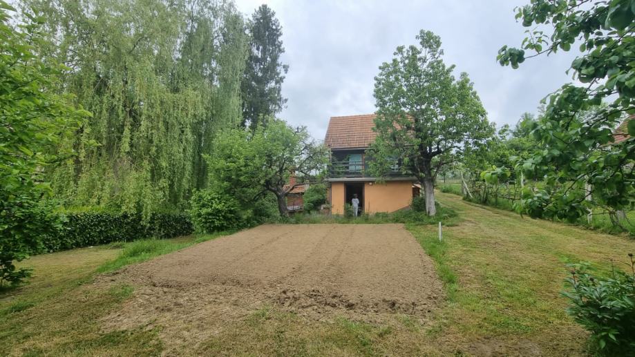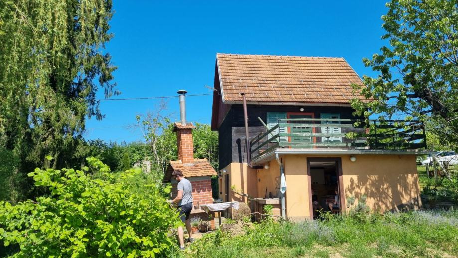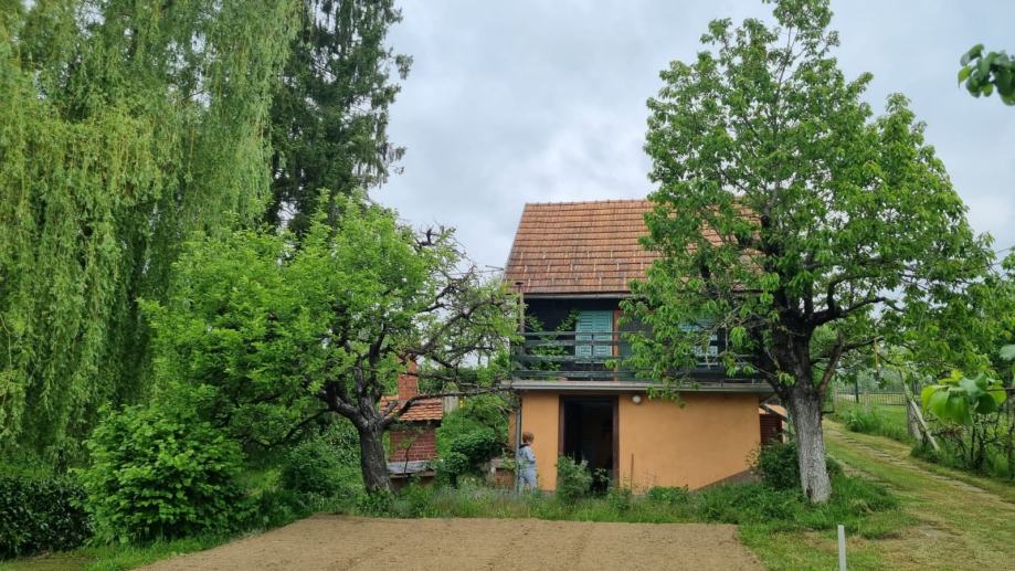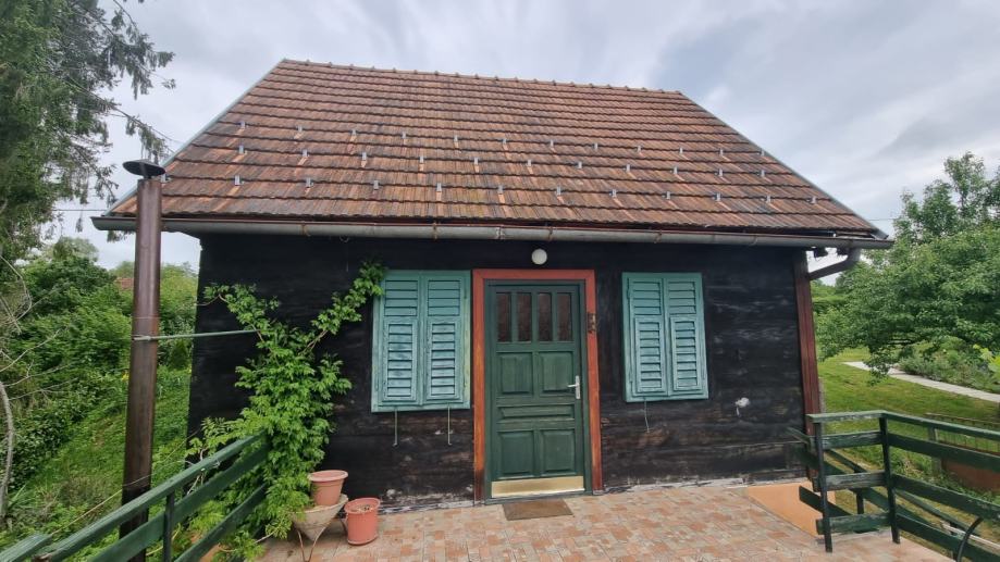 Prodaje se drvena vikendica od starih hrastovih planjki s vlastitim izvorom vode, dnevna soba s sofama i kuhinjom, kupaonica topla voda, spavaonica u potkrovlju, ljetna kuhinja nalazi se ispod terase, podrum, ukupno 91,00 m2, na parceli od 1.404 m2, u Dvorancima, Pisarovina, sa dodatnom garažom od 45m2, voćnjakom, vrtom.