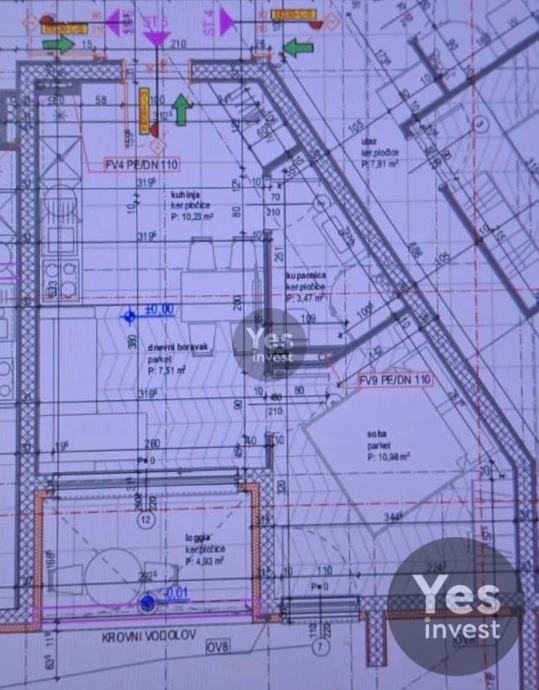 Tlocrt pokazuje dnevni boravak s parketom koji se otvara prema lođi od oko 4,80 m², spavaću sobu od nešto više od 10 m² s parketom, kuhinju od oko 10 m² te kupaonicu s WC-om. Stan je orijentiran prema jugu i istoku, što znači da ima prirodnog svjetla tijekom većeg dijela dana.