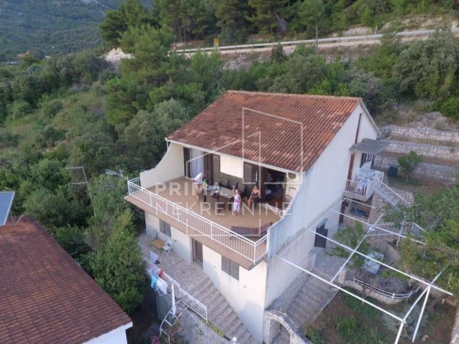 Opis i lokacija samog objekta: kuća s predivnim pogledom, prostire se na dvije etaže površine 300 m2 obračunato prema koeficijentu, na parceli od 560 m2. Udaljenost do mora 2 minute.