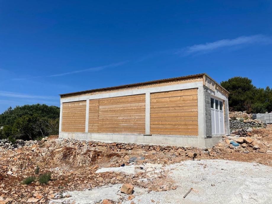 Nova kuća u roh bau izvedbi do stolarije na zemjištu 412m2, zidano blokovima, iskopana rupa za šternu i crnu jamu. Prilaz automobilom, 100 metara od mora, prekrasan pogled.