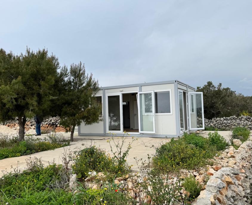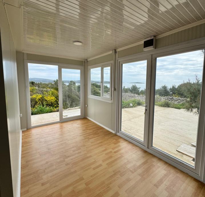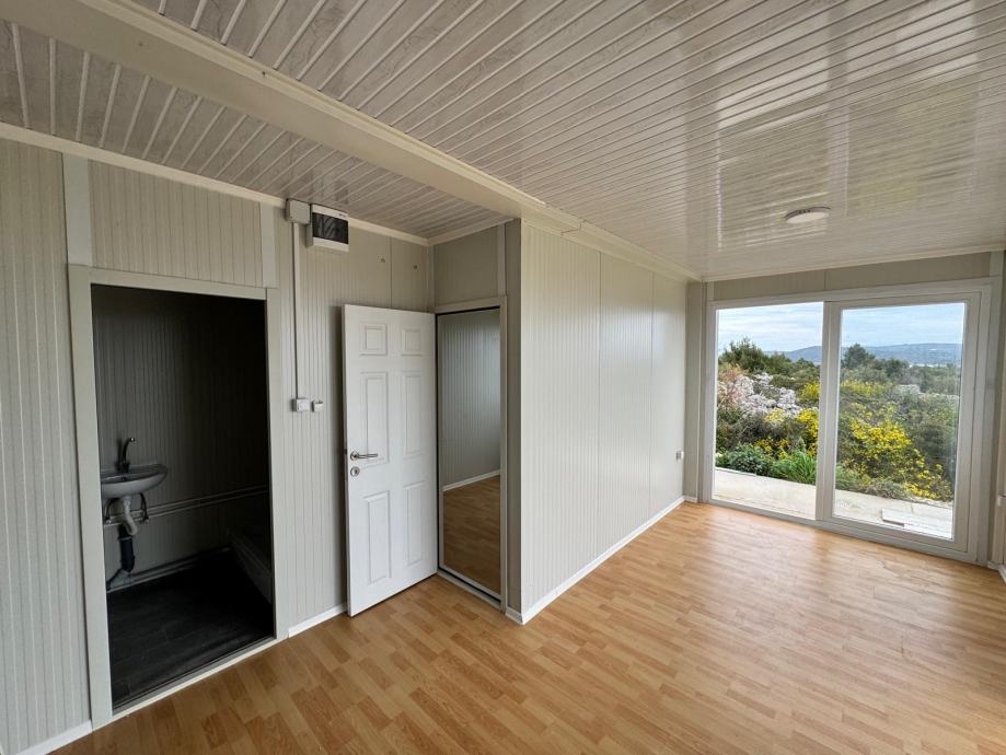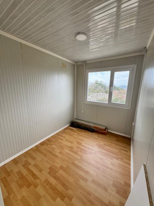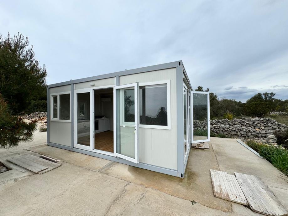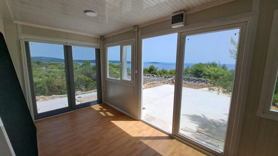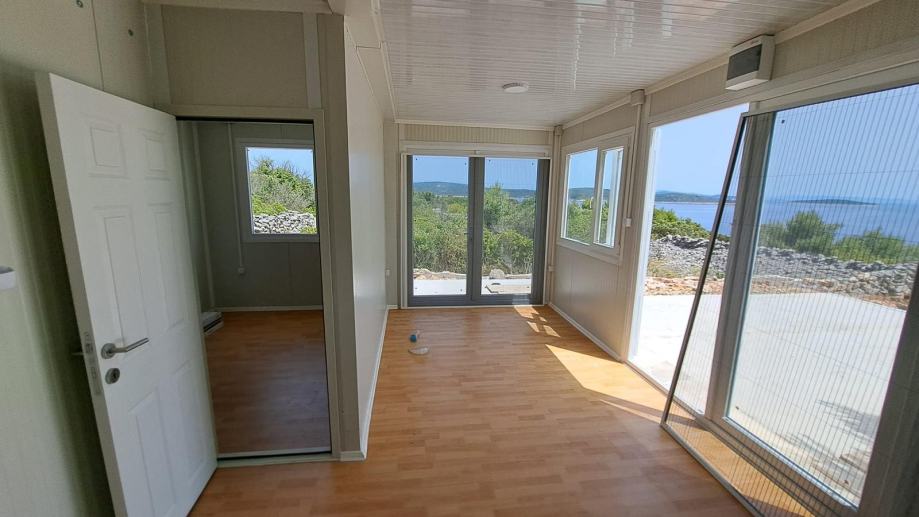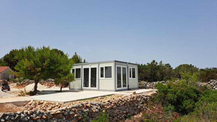 Mobilna kućica - stambeni kontejner također uključuje kupatilo (tus, bojler , umivaonik i toalet) te jednu spavaću sobu, pružajući osnovne uvjete za ugodan život. Nalazi se na otoku Mali Drvenik u blizini Trogira.