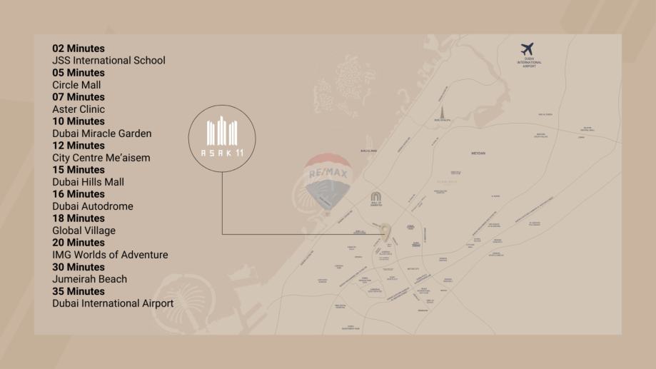 Projekt se nalazi u JVC-u. Jumeirah Village Circle (JVC) u srcu novog Dubaija nudi izvrsnu lokaciju s odličnom povezanošću s različitim dijelovima grada, što ga čini traženom destinacijom za iznajmljivače i kupce koji traže pristupačne apartmane i vile. Kombinacija mirnog okruženja i modernih pogodnosti čini JVC privlačnom opcijom za one koji traže uravnotežen način života u Dubaiju.