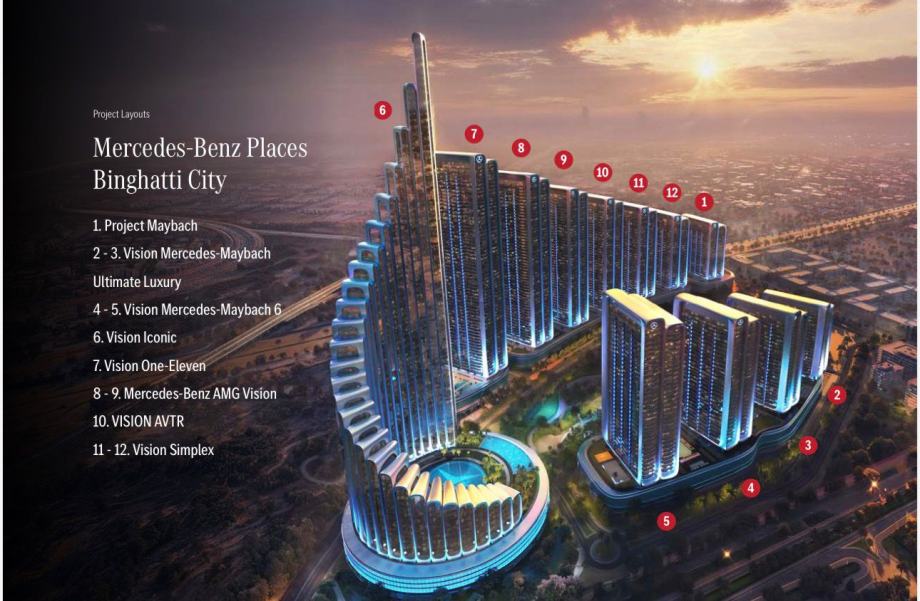 Mercedes-Benz Places | Binghatti City je ambiciozan projekt masterplaniranog grada u Dubaiju, smješten u četvrti Nad Al Sheba (Meydan), koji obuhvaća više od 10 milijuna četvornih stopa površine. Ovaj razvojni projekt sastoji se od 12 monumentalnih tornjeva, svaki nazvan po ikoničnim konceptnim vozilima Mercedes-Benza, spajajući automobilske dizajnerske principe s arhitekturom. Grad je dizajniran kao “grad unutar grada” s preko 13.000 rezidencijalnih jedinica, maloprodajnim prostorima, parkovima, zelenim koridorima, stazama za trčanje i bicikle, te luksuznim sadržajima poput kafića, bazena i kulturnih prostora. Svaki toranj utjelovljuje filozofiju “senzualne čistoće” – fluidne, isklesane forme inspirirane kinetičkom energijom automobila, s fokusom na preciznost, emocionalnu privlačnost i održivost.