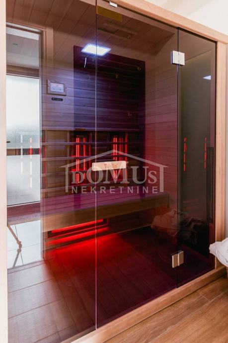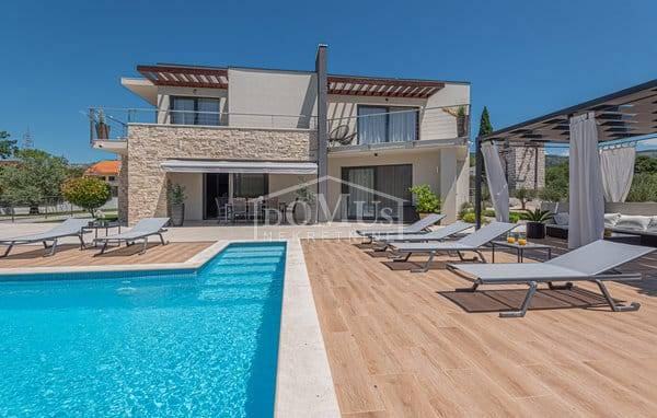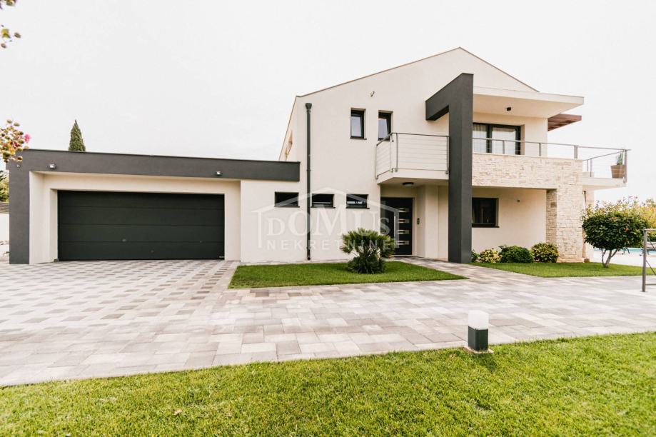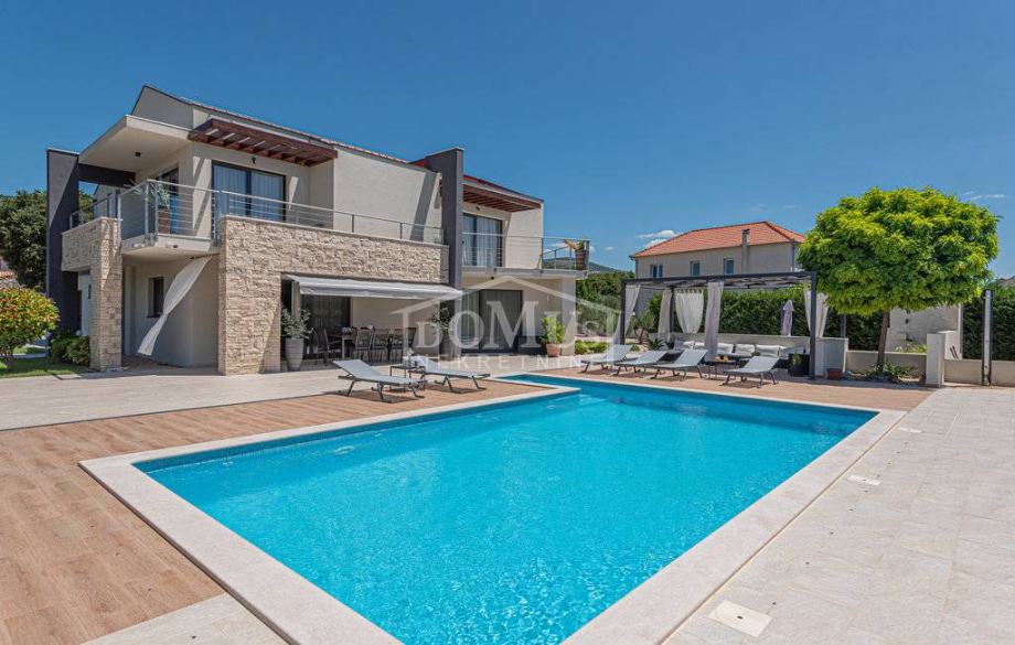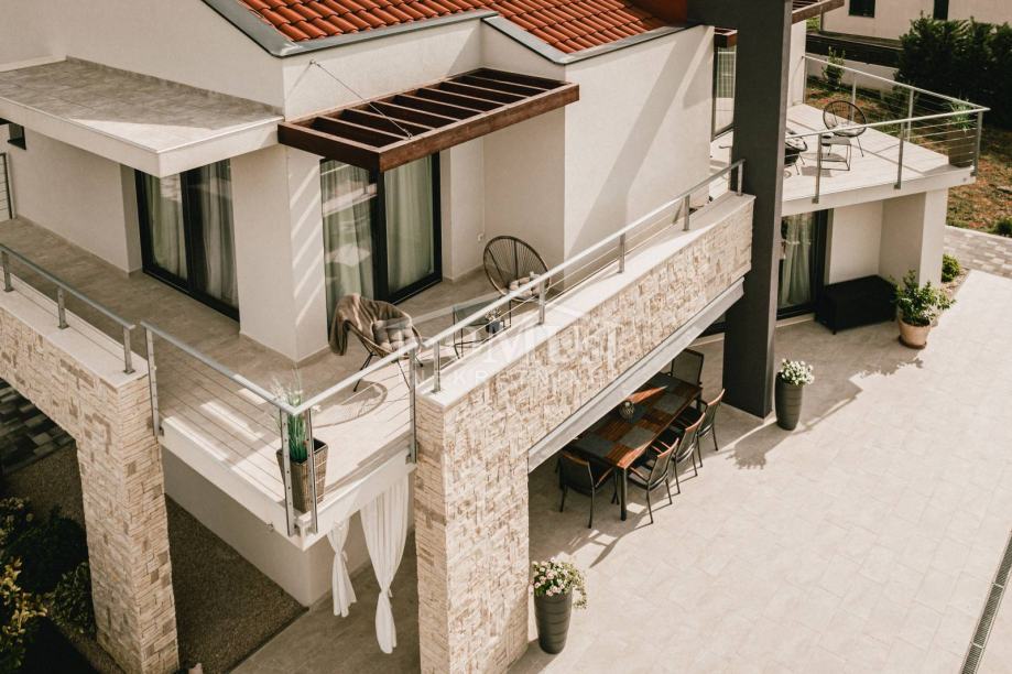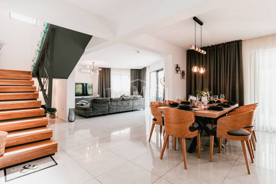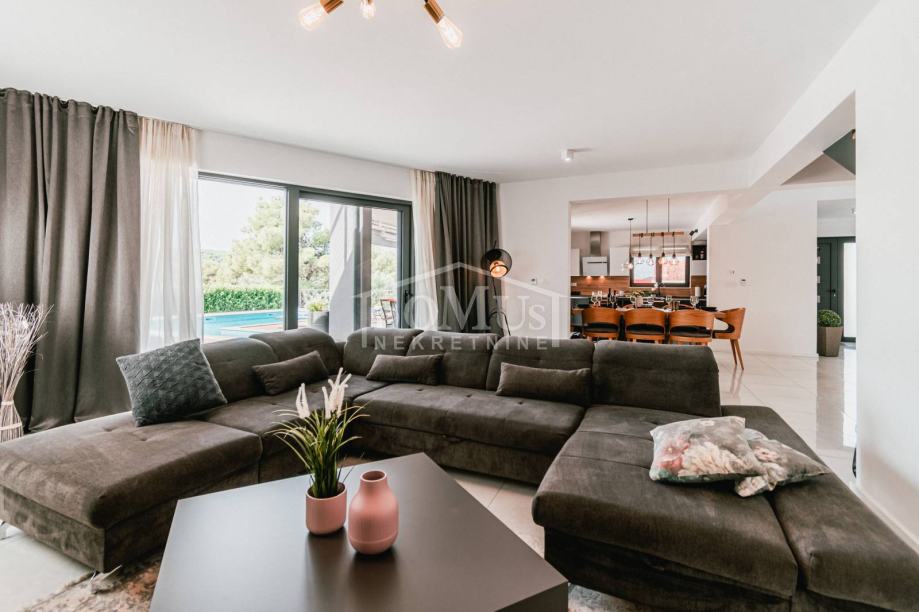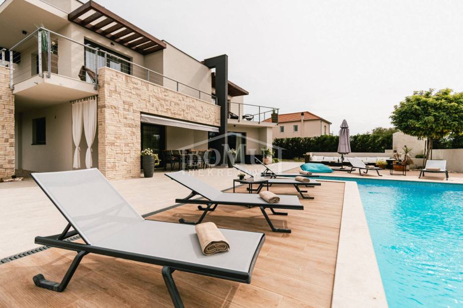 U mirnom okruženju u Dubravi kraj Šibenika, smještena je Villa, moderne arhitekture i funkcionalnog rasporeda sa bazenom i garažom, ukupne korisne površine od 266,13m2, sagrađena na parceli od 1.831m2. Sastoji se od prostorne kuhinje i blagovaone te prostranog dnevnog boravka iz kojeg se izlazi na terasu, toalet, spavaće sobe, saune, kupaonica, strojarnica, garaža te stubište za kat gdje se nalazi predsoblje, 3 spavaće svaka ima svoju terasu, od kojih 2 sobe imaju vlastitu kupaonicu te dodatna 1 zasebna kupaona. Kuća je komplet namještena, opremljena s podnim grijanjem u svim prostorijama sa odvojenom regulacijom temperature preko dizalice topline, klima uređaji u svakoj prostoriji, video nadzor, solarni panel, automatsko podzemno navodnjavanje okoliša, Dvorište je u potpunosti ograđeno, isto pruža dosta privatnosti, u sklopu terase je sunčalište i bazen površine 50m2 (5,2mx9,6m), vanjski roštilj i mini vanjska kuhinja, igralište za basket. Do centra Šibenika 4 km, a do plaže udaljeno 6 km.