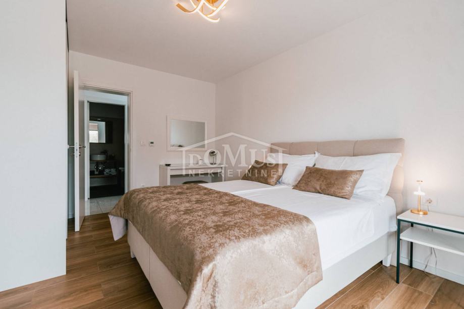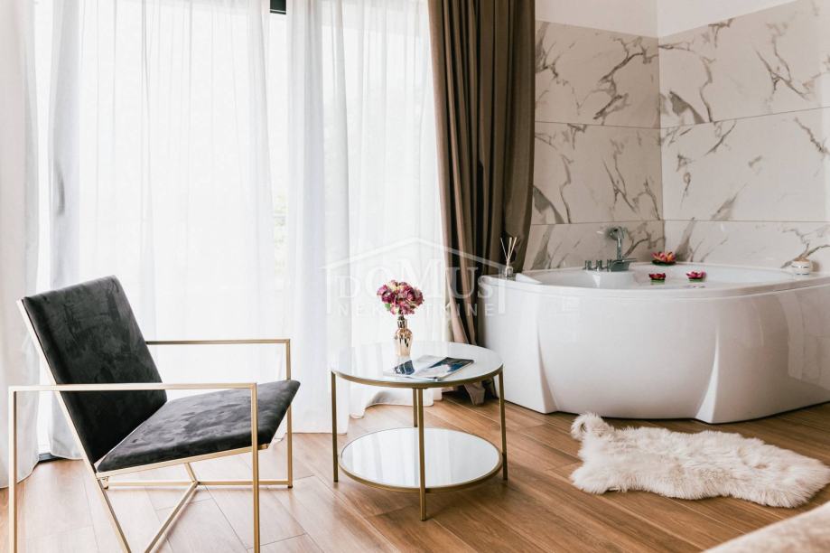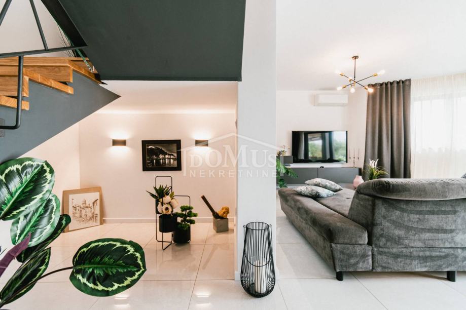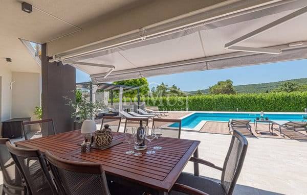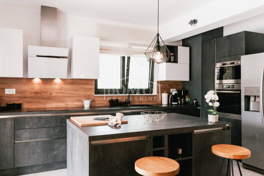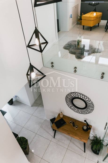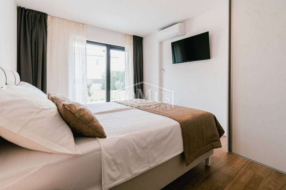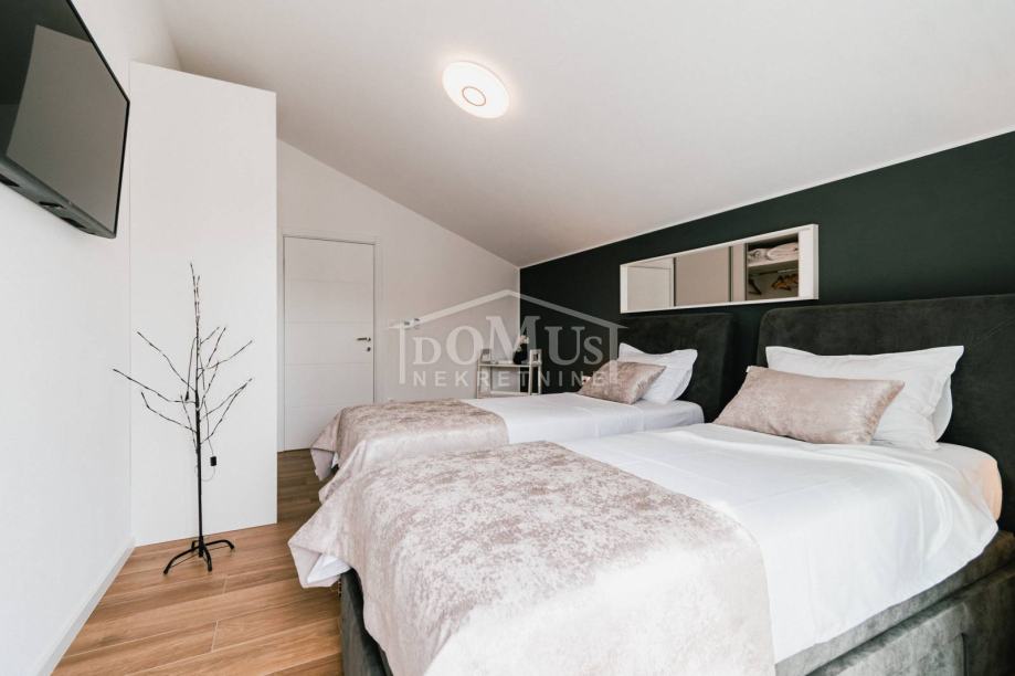 U mirnom okruženju u Dubravi kraj Šibenika, smještena je Villa, moderne arhitekture i funkcionalnog rasporeda sa bazenom i garažom, ukupne korisne površine od 266,13m2, sagrađena na parceli od 1.831m2. Sastoji se od prostorne kuhinje i blagovaone te prostranog dnevnog boravka iz kojeg se izlazi na terasu, toalet, spavaće sobe, saune, kupaonica, strojarnica, garaža te stubište za kat gdje se nalazi predsoblje, 3 spavaće svaka ima svoju terasu, od kojih 2 sobe imaju vlastitu kupaonicu te dodatna 1 zasebna kupaona. Kuća je komplet namještena, opremljena s podnim grijanjem u svim prostorijama sa odvojenom regulacijom temperature preko dizalice topline, klima uređaji u svakoj prostoriji, video nadzor, solarni panel, automatsko podzemno navodnjavanje okoliša, Dvorište je u potpunosti ograđeno, isto pruža dosta privatnosti, u sklopu terase je sunčalište i bazen površine 50m2 (5,2mx9,6m), vanjski roštilj i mini vanjska kuhinja, igralište za basket. Do centra Šibenika 4 km, a do plaže udaljeno 6 km.
