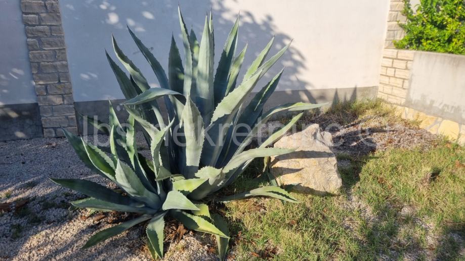 Okućnica je pomno uređena – s nasadima maslina, palmama i autentičnim mediteranskim biljem. U prednjem dijelu nalazi se parking, dok se u stražnjem dijelu nalazi bazen s vanjskim tušem, okružen zelenilom. Cijela parcela ograđena je visokim zidovima, što osigurava potpunu privatnost i mir.