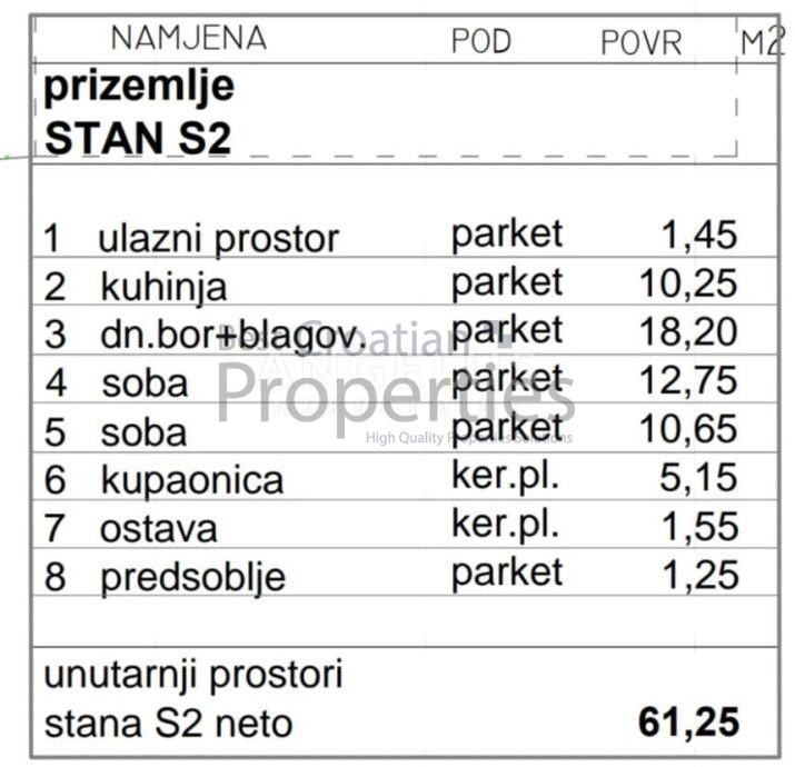 • Ulazni prostor• Dnevna soba + blagovaonica• Kuhinja• Kupaonica• 2 x Spavaća soba• Ostava• PredsobljeUKUPNO STAMBENO = 61,25 m2• Vrt 1- 10 m2• Vrt 2- 12 m2• Vanjsko parkirno mjesto 12,5 m2UKUPNO OBRAČUNSKO: 66,58 m2