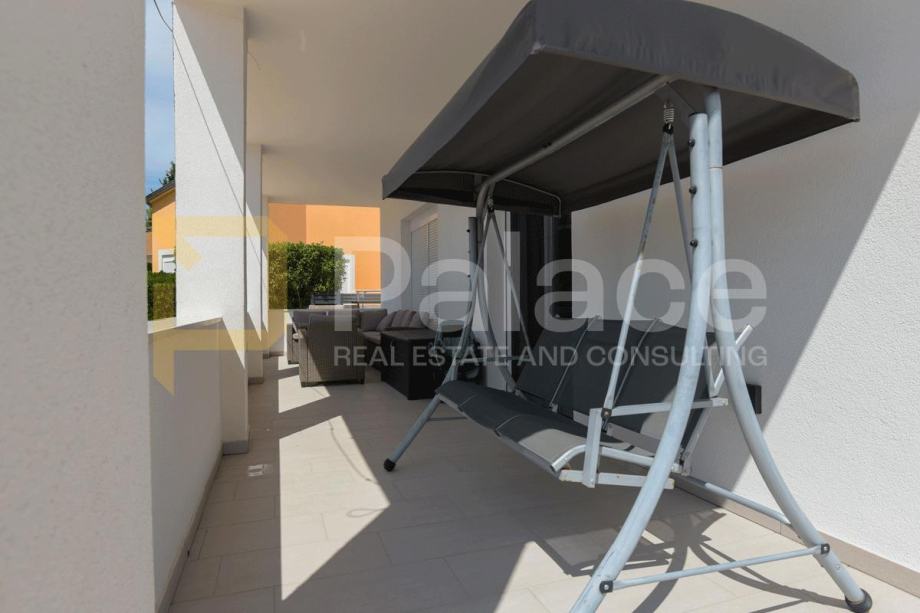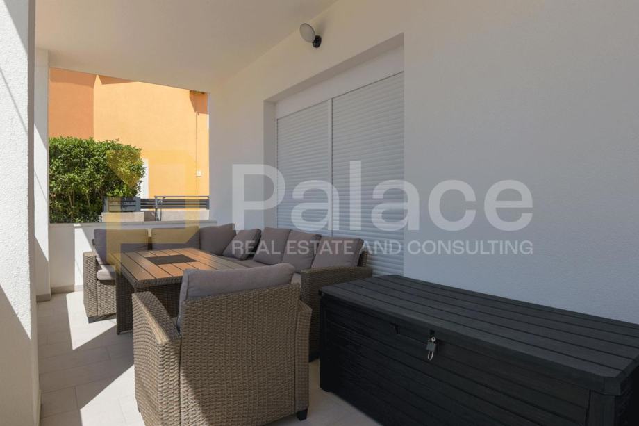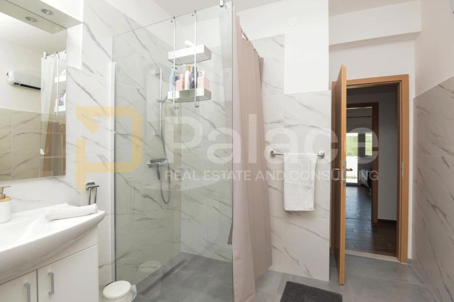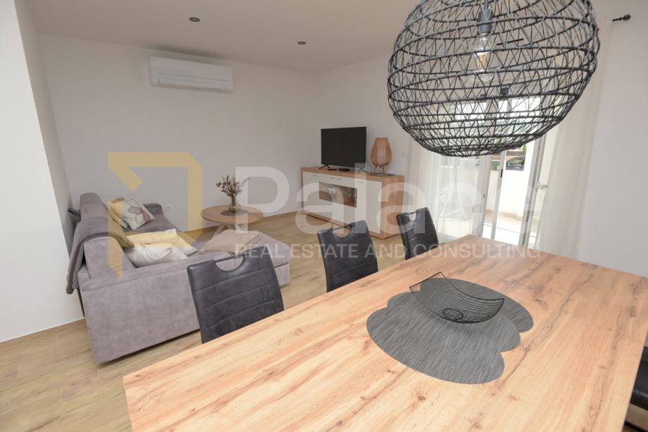 Stan u prizemlju se sastoji od ulaznog predsoblja koje vodi ka otvorenom konceptu kuhinje, blagovaonice i dnevnog boravka s izlazom na terasu, dvije spavaće sobe, kupaonica s WC-om te ostave.