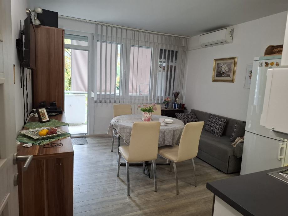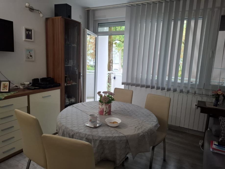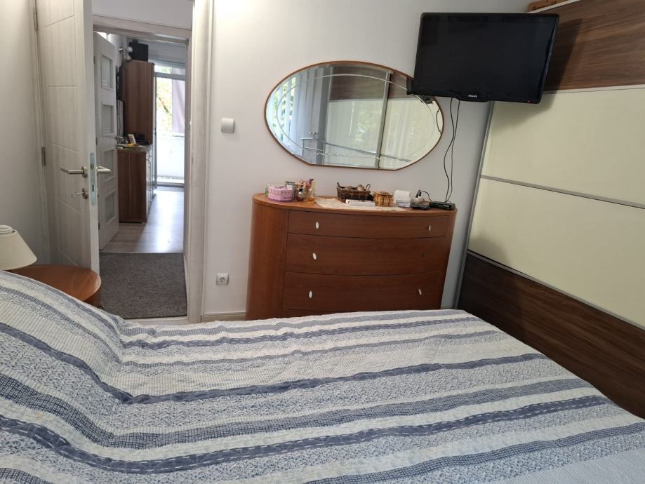 Stan je svijetao, ugodan i funkcionalno uređen/opremljen. Dobar tlocrt. Balkon, na koji se ide iz dn. boravka/kuhinje gleda na južnu, zelenu stranu. I druge dvije prostorije gledaju na zelenilo, s pristojnom udaljenosti od drugih zgrada.
