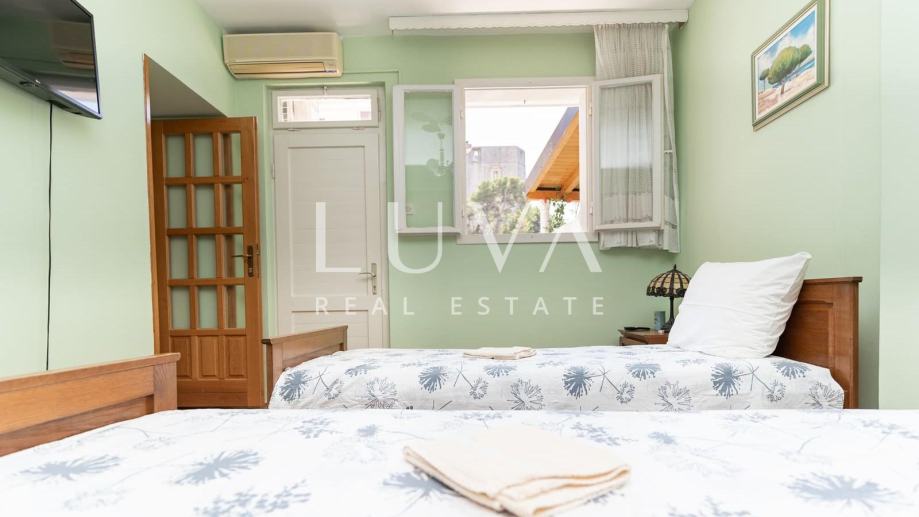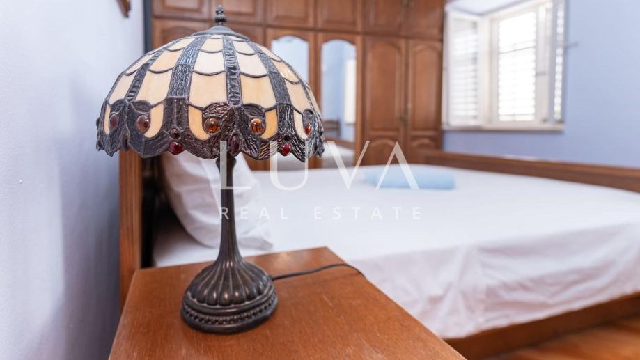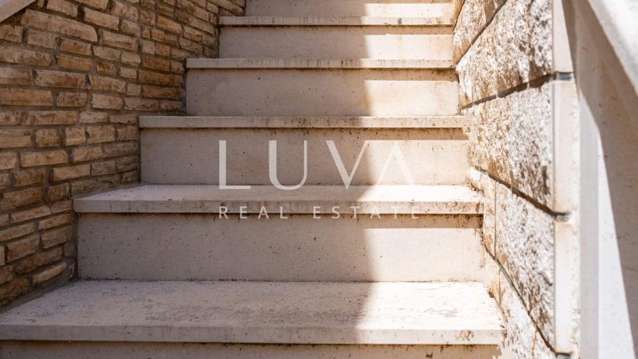 Kuća je organizirana na dvije etaže. U prizemlju se nalazi dnevni boravak povezan s kuhinjom te kupaonica, dok su na gornjoj etaži dvije udobne spavaće sobe i dodatna kupaonica. Prostrana terasa idealno je mjesto za opuštanje ili uživanje u jutarnjoj kavi s nezaboravnim pogledom na povijesne zidine i more.