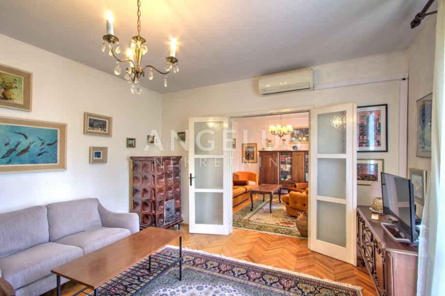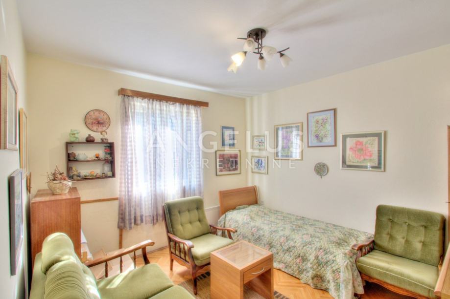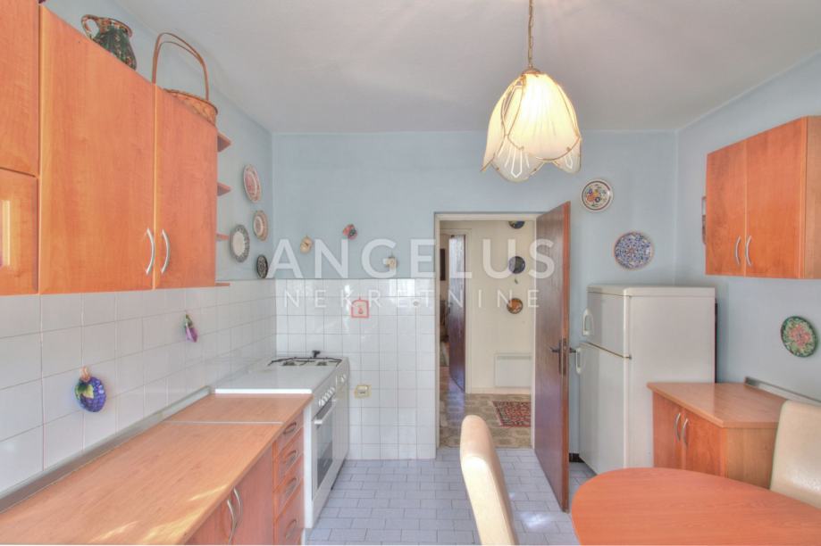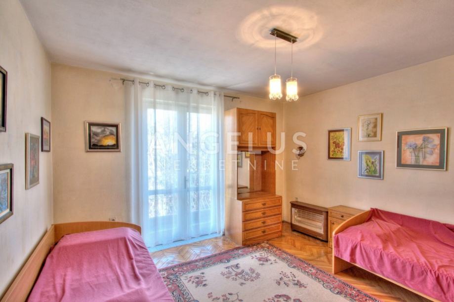 Ovaj prostrani četverosobni stan smješten je na prvom katu manje stambene kuće, koja ima samo dvije etaže – na svakoj etaži nalazi se po jedan stan, što osigurava dodatnu privatnost. Raspored stana je vrlo funkcionalan – središnji hodnik povezuje sve prostorije, uključujući četiri sobe, dnevni boravak, odvojenu kuhinju, ostavu i dvije manje kupaonice. Iz dnevnog boravka i dvije sobe izlazi se na balkon površine 12 m².