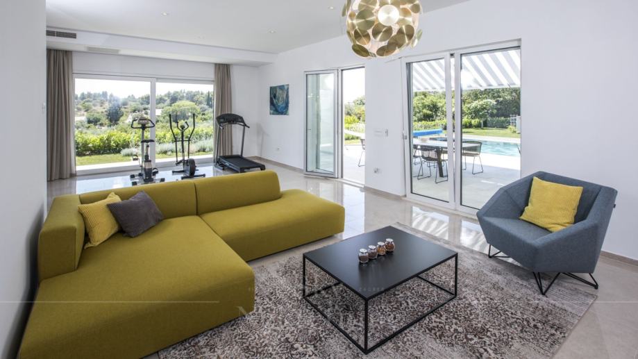 U prizemlju vile nalaze se dnevni boravak, kuhinja, blagovaonica, kupaonica te prostor za teretanu. Velika klizna vrata iz dnevnog boravka otvaraju se na terasu i bazen.