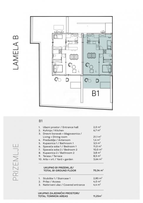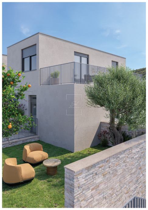 Ova luksuzna novogradnja sastoji se od garažnog prostora sa ukupno osam parkirnih mjesta te četiri stambene jedinice – dvije jednoetažne u prizemlju i dvije dvoetažne na prvom katu (s visokim potkrovljem).