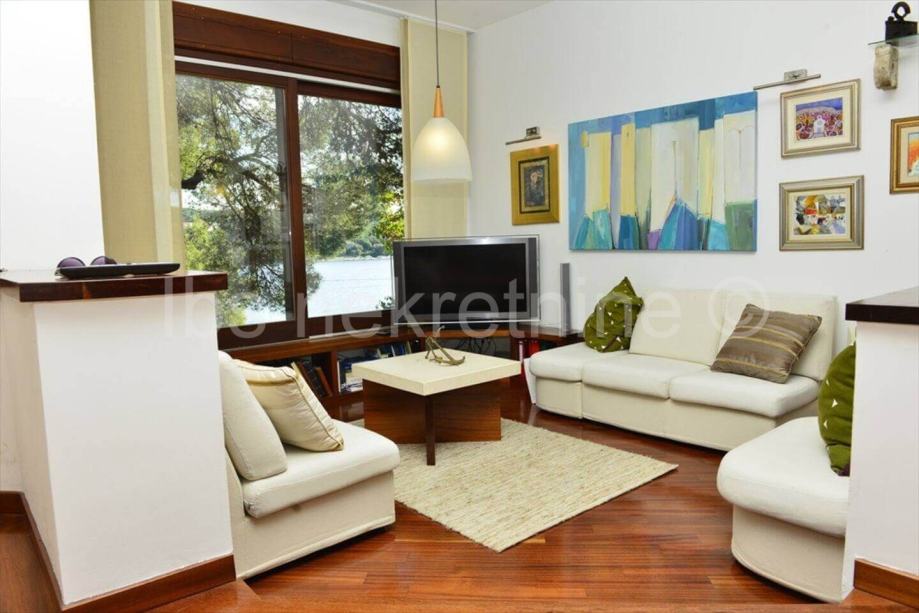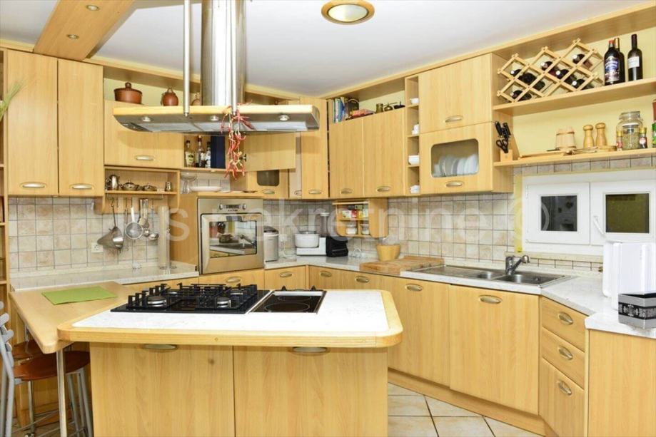 Prizemlje čini 70 četvornih metara otvorenog prostora s dnevnim boravkom, blagovaonicom i kuhinjom te tuš kabinom/WC-om, raspoređenim na različitim razinama, tako da se iz kuhinje stepenicama spušta u blagovaonicu/dnevnu sobu. Cijeli pod je obložen keramičkim pločicama. Veliki prozori i francuska vrata otvaraju se na terase i vrt s pogledom na more i mirisom mediteranskog bilja koji ulazi u kuću. Kuhinja je opremljena hladnjakom sa zamrzivačem, pećnicom, pločom za kuhanje na struju/plin, perilicom posuđa, ledomatom, mikserom za hranu, tosterom, aparatom za kavu, kuhalom za vodu, posuđem od nehrđajućeg čelika, dobrim tanjurima, priborom za jelo i staklom. Iz kuhinje se izlazi na vrtnu terasu s vanjskim stolom za blagovanje. Atraktivan moderan kamin i posebno dizajnirane drvene spiralne stepenice odvajaju kuhinju od dnevne sobe koja se nalazi ispod kuhinje. Dnevni boravak ima udobne sofe, 50" LCD SAT TV i surround sound system. Nasuprot dnevnog boravka nalazi se lijepo dizajnersko izrađeno stubište. Dodatno na katu je zasebna kupaonica WC