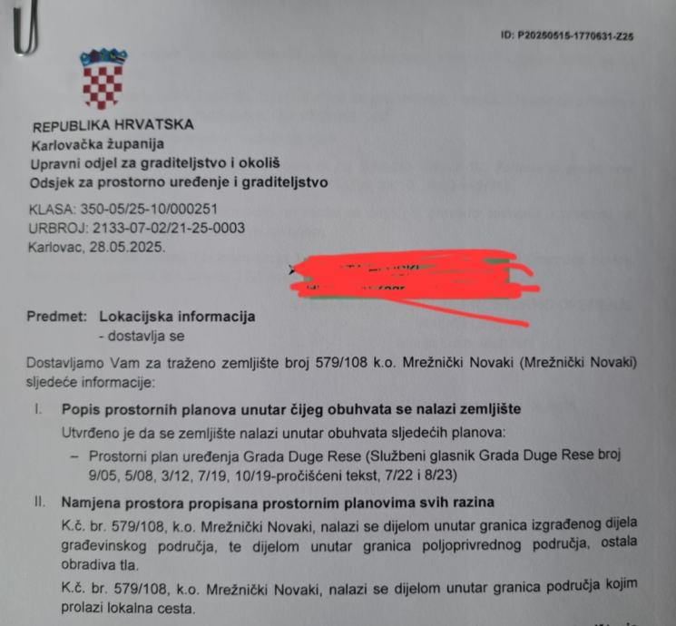 Duga Resa, gradilište cca 50x100 m - 4956 m2, pola građevinsko/pola poljoprivredno, lokacijska informacija, vlasništvo 1/1, put sa dvije strane, cca 20 m do svih komunalija, blizu centra, Mrežnice i kampa Slapić, 60.000,00 eur. Zvati na 091/5395-400.