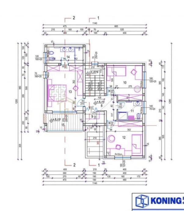 1. kat - 3 spavaće sobe od čega su 2 po 15m2, a treća je 20m2 i ima svoju kupaonicu i terasu s pogledom na more, također na katu se nalazi još jedna kupaonica.