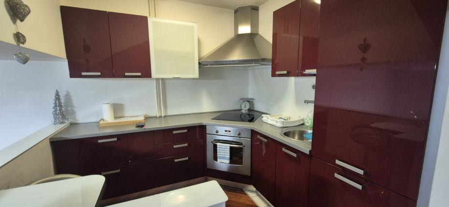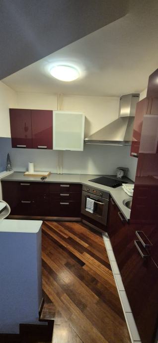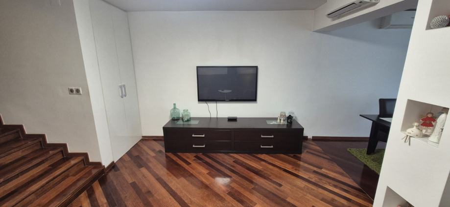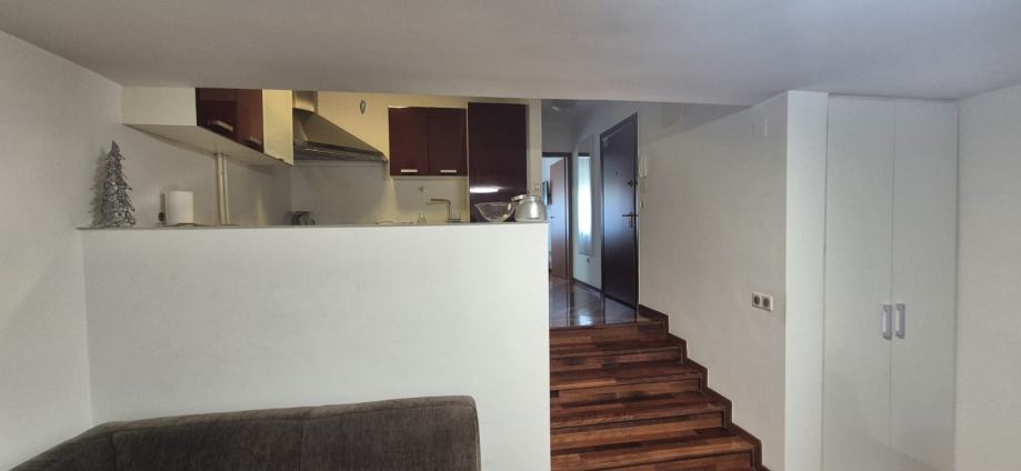 Dnevni boravak s blagovaonicom prostrana je i svijetla zona s parketom tamnog drva i izlazom prema vrtu. Kuhinja je otvorena prema dnevnom boravku, s bijelim radnim površinama i ugrađenim sudoperom. Uz dnevni boravak i kuhinju, stan ima jednu spavaću sobu te kupaonicu s WC-om.