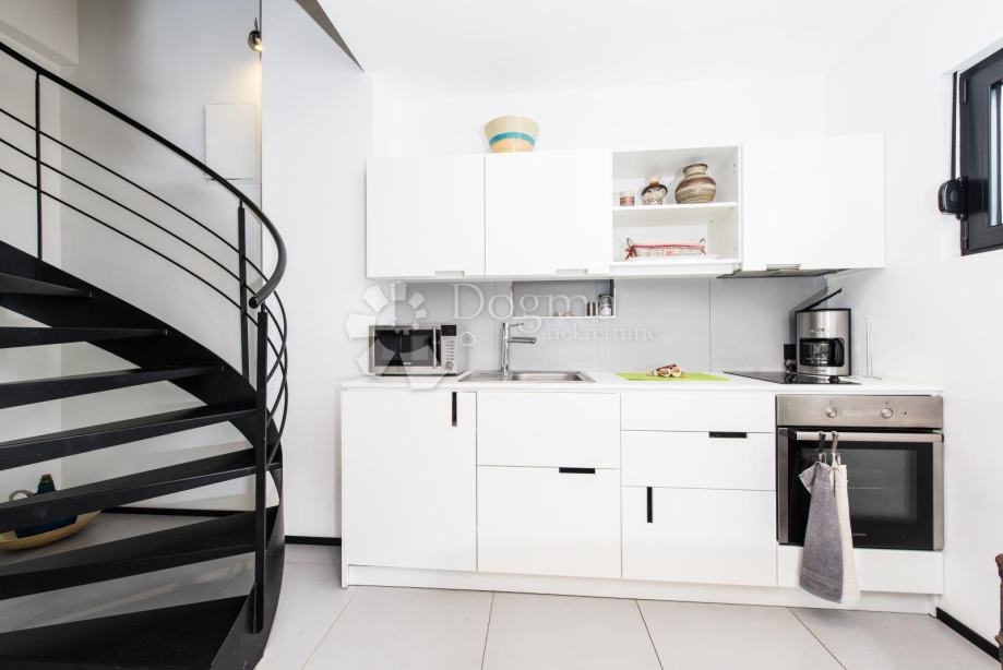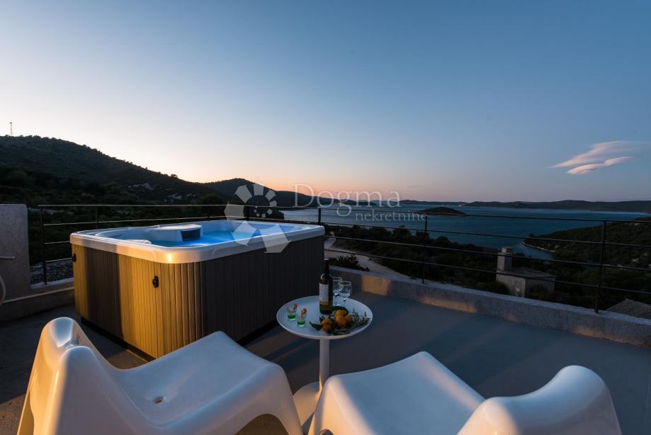 Na drugom katu nalazi se dnevni boravak i izlaz na krovnu terasu gdje se iz toplog jacuzzija uz čašu pića po želji pruža spektakularan pogled na razvedeno otočje i more.