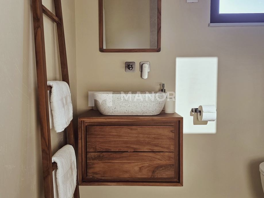 Svaki detalj izveden je s pažnjom: interijer od hrastovine, vanjski namještaj izrađen od tikovine, svaka soba i dnevni boravak opremljeni su Smart TV-om. Kuhinja, proizvedena po mjeri, opremljena je najvišim standardima uz Bosch aparate, a posuđe brendova Villeroy & Boch i WMF dodatno potvrđuje razinu luksuza. Uređena okućnica u mediteranskom stilu s bazenom dimenzija 9 × 4 m, čija tirkizna nijansa poziva na osvježenje i relaksaciju.