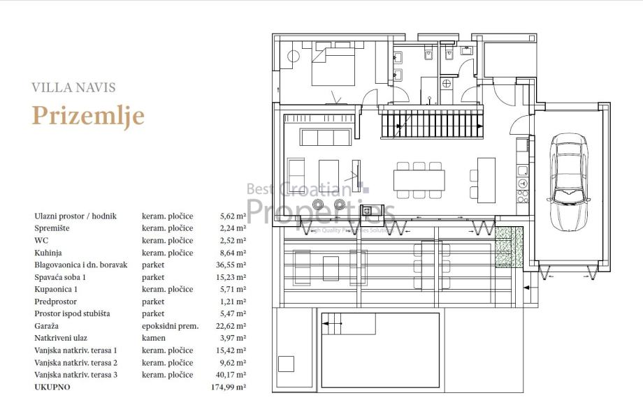 Prizemlje (175 m²): hodnik, WC, dvije ostave, prostrana kuhinja s blagovaonicom i dnevnim boravkom, spavaća soba s vlastitom kupaonicom, garaža te čak tri prostrane terase za maksimalan užitak na otvorenom