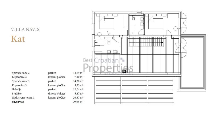 Kat (80 m²): dvije udobne spavaće sobe, kupaonica, galerija i natkrivena terasakoja nudi dodatnu privatnost i pogled
