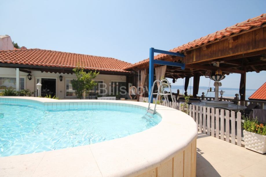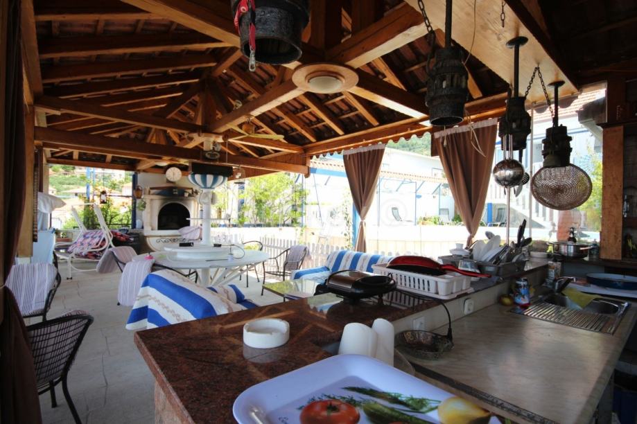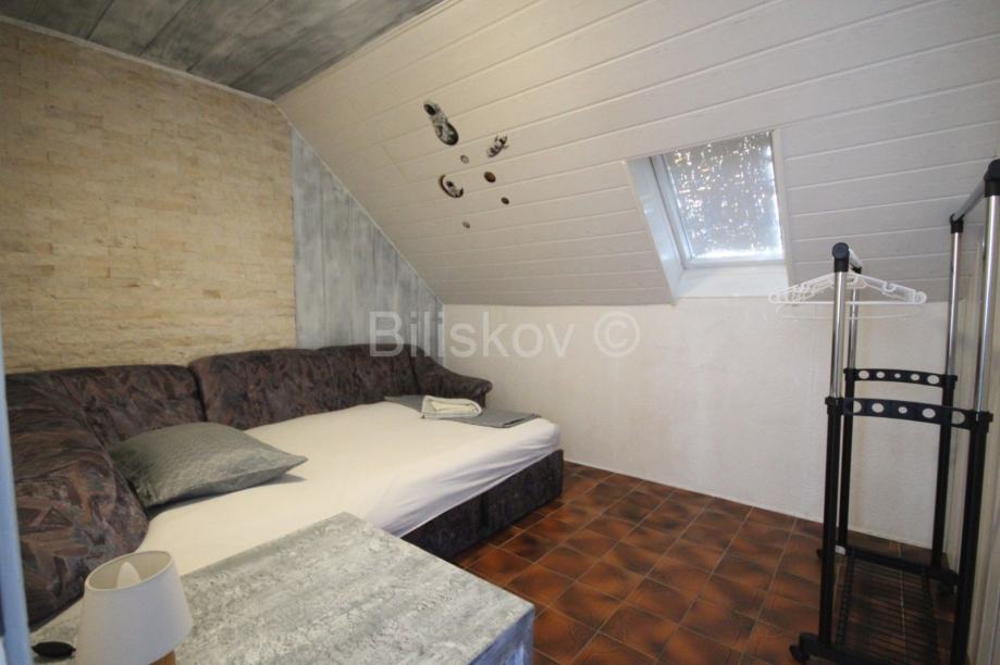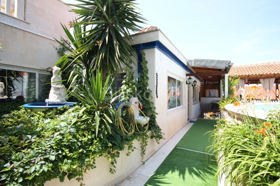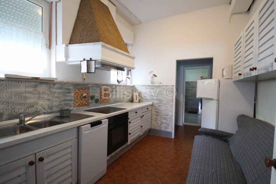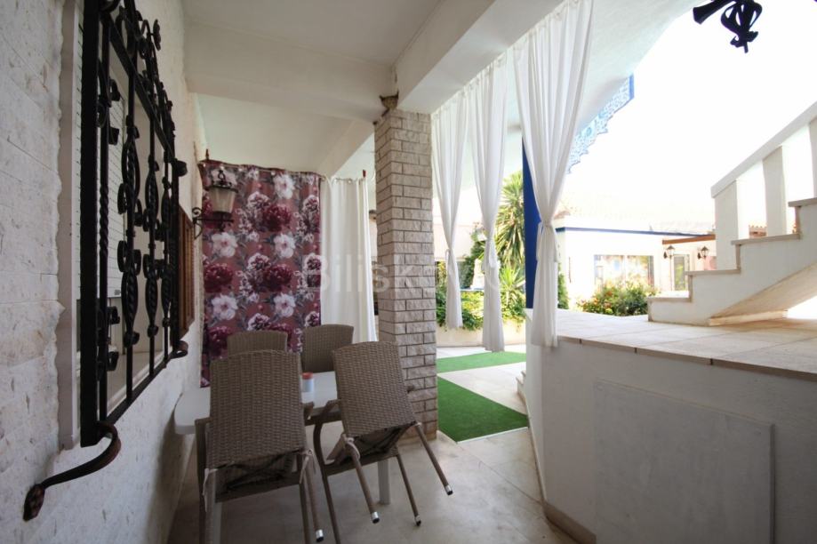 U prizemlju se nalazi samostojeći objekt površine 120m2 u naravi komforan dvosoban stan s vlastitom terasom i roštiljem do kojeg se nalazi bazen.