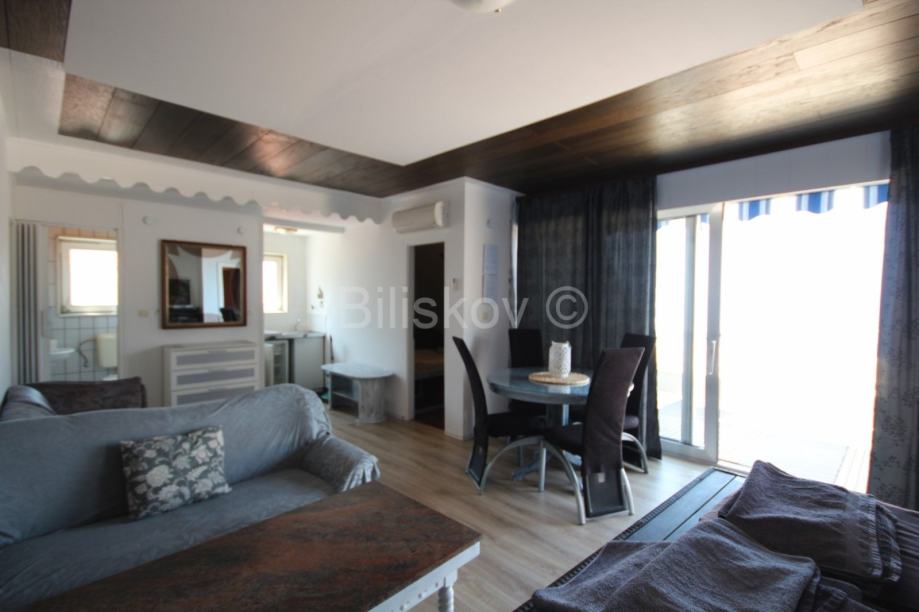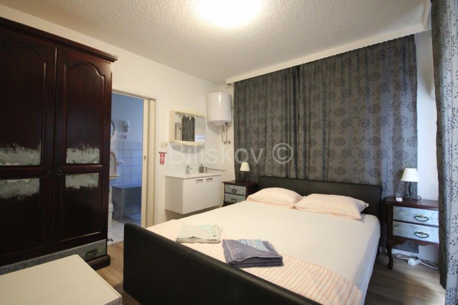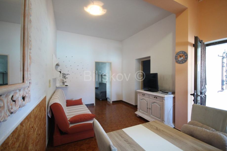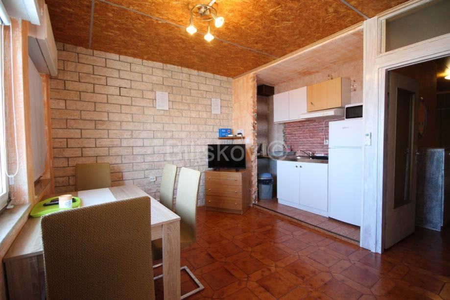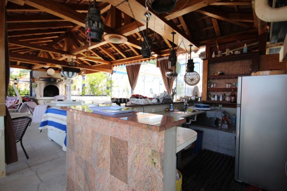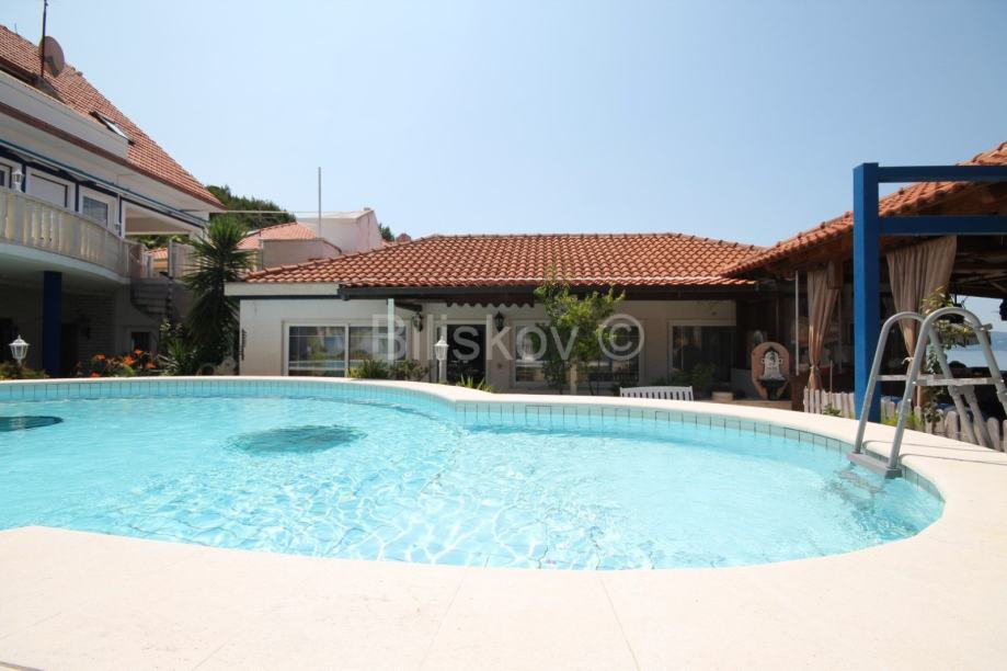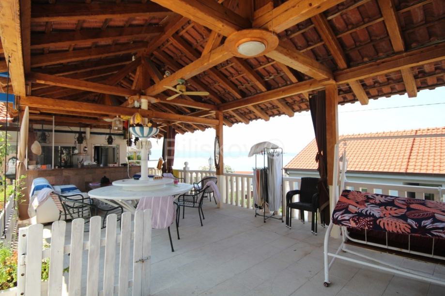 U prizemlju se nalazi samostojeći objekt površine 120m2 u naravi komforan dvosoban stan s vlastitom terasom i roštiljem do kojeg se nalazi bazen.