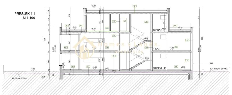 Tlocrtno organizirana u prizemlje, kat i uvučeni kat