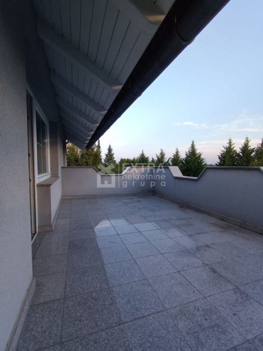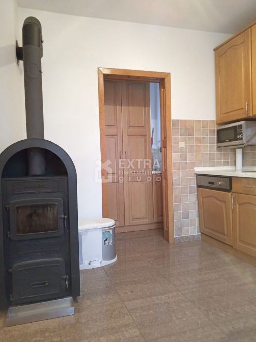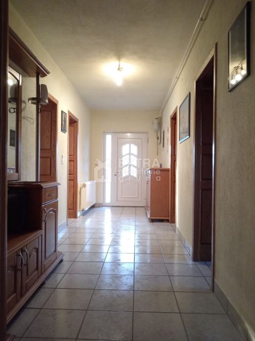 Na prvom katu kuće, odnosno potkrovlju nalazi se također četverosoban stan koji se sastoji od ulaznog prostora/hodnika, kuhinje i blagovaonice s izlazom na terasu te dnevnog boravka, tri spavaće sobe te kupaonice i WC-a. Potkrovlje je u roh bau izvedbi i potrebno je uređenje.