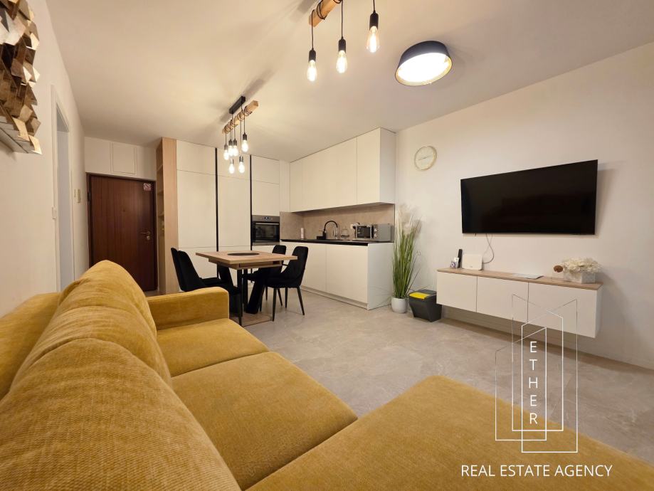 The apartment consists of an entrance area that leads to a functionally designed kitchen connected to the dining room and living room, creating an open and pleasant space for everyday life and socializing. There are two comfortable bedrooms, a bathroom and a furnished balcony, ideal for relaxing with a view of the greenery and enjoying the peaceful surroundings.